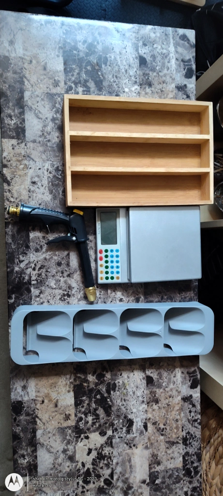 A wooden shelf with three levels. Includes a digital scale and a garden hose nozzle.