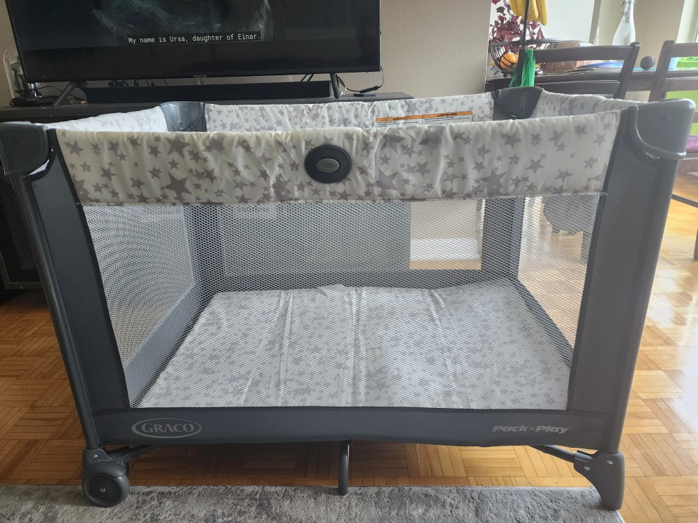 Foldable for easy transport (comes with bag). We have an extra mattress we added in for comfort (see pics, it's kept wrapped for now). selling with the mattress.
