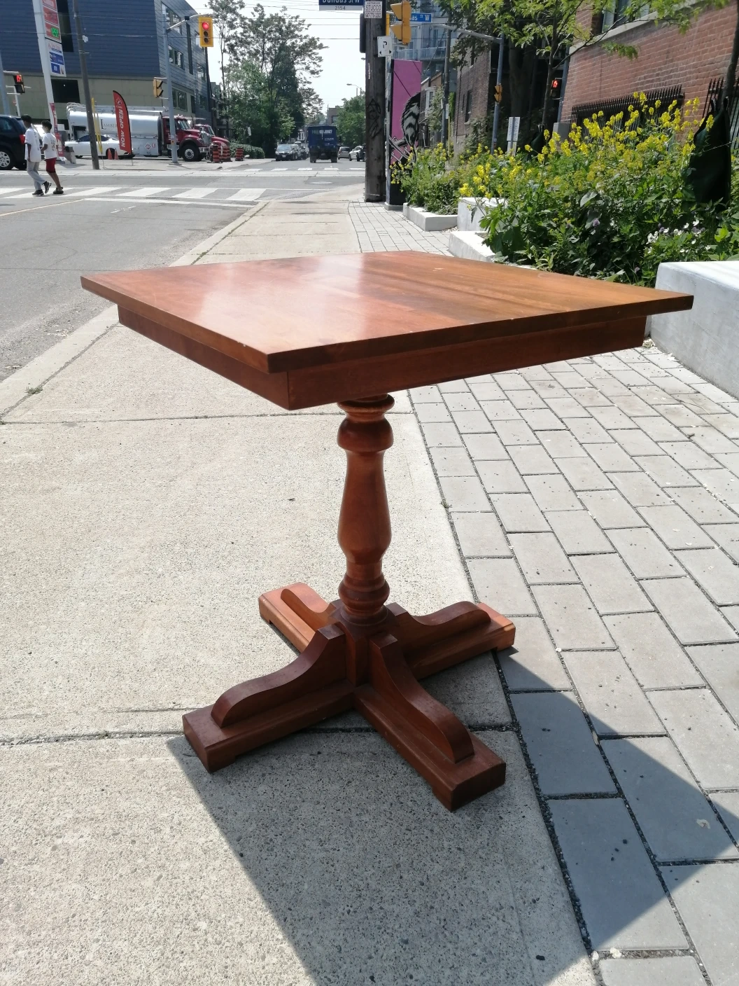 A beautiful wooden table. Featuring a square top, connected to a pedestal base. The base is a cross design for stability.