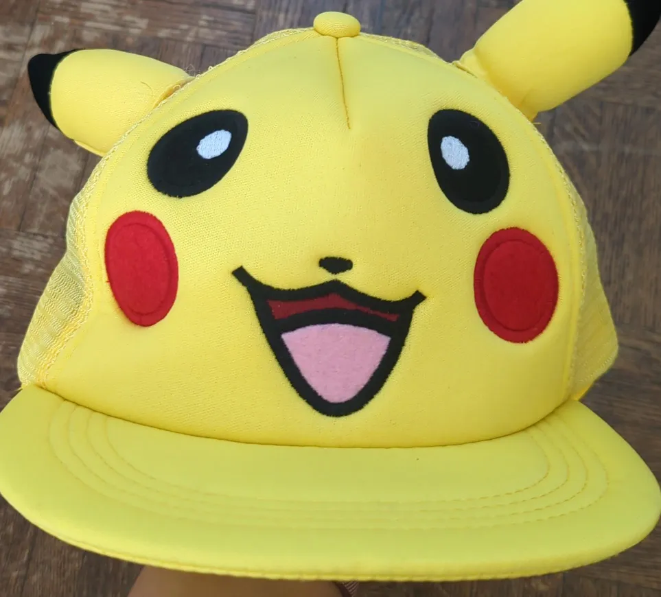 A yellow adult Pikachu baseball cap. Comes with a mesh back and adjustable strap. Size can be adjusted to be quite big.