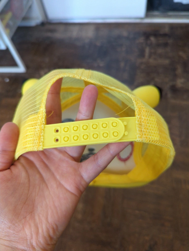A yellow adult Pikachu baseball cap. Comes with a mesh back and adjustable strap. Size can be adjusted to be quite big.