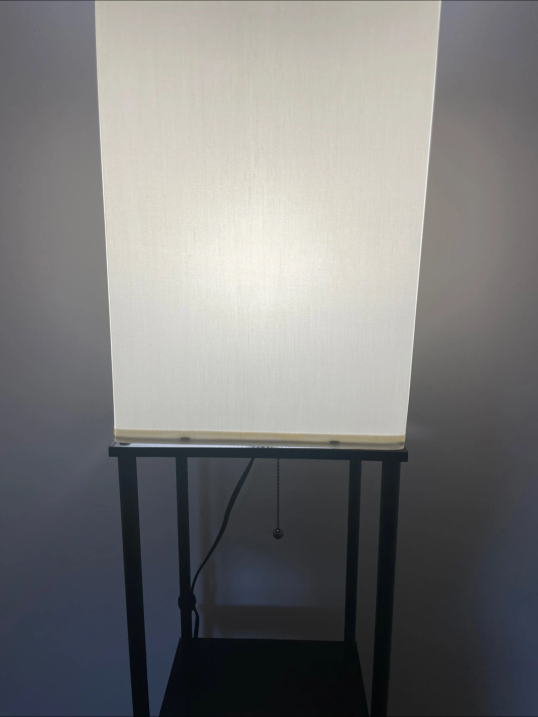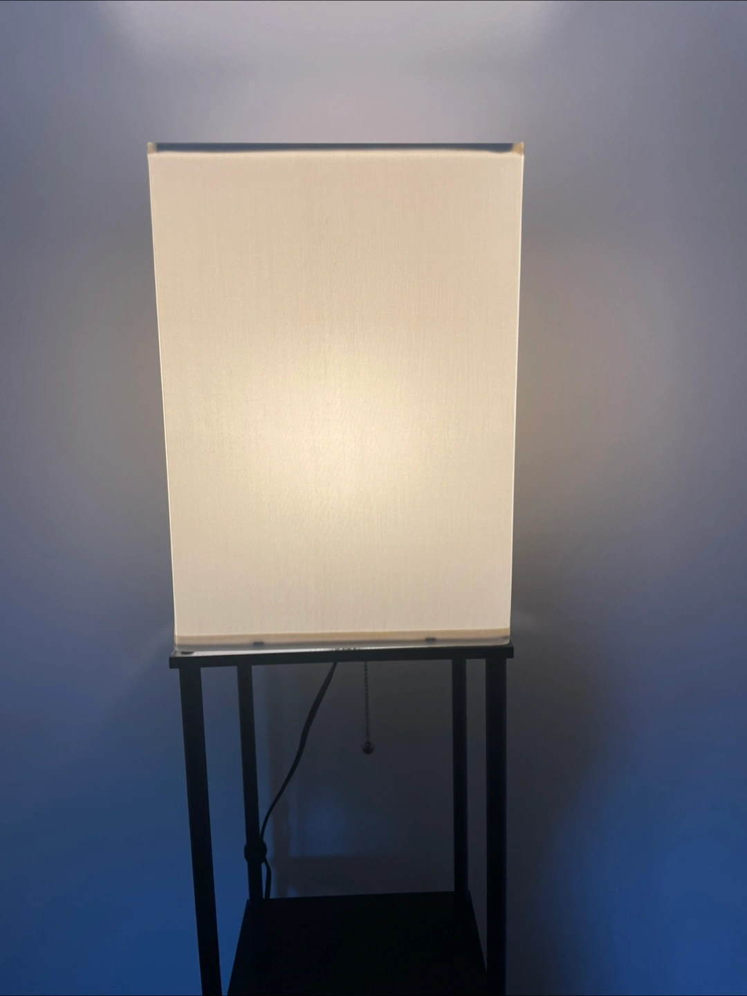This floor lamp features 3 shelves for displaying items or storage. It has 3 different light settings for whatever mood you’re in! It’s in excellent condition. I’m moving and I can’t take this with me.