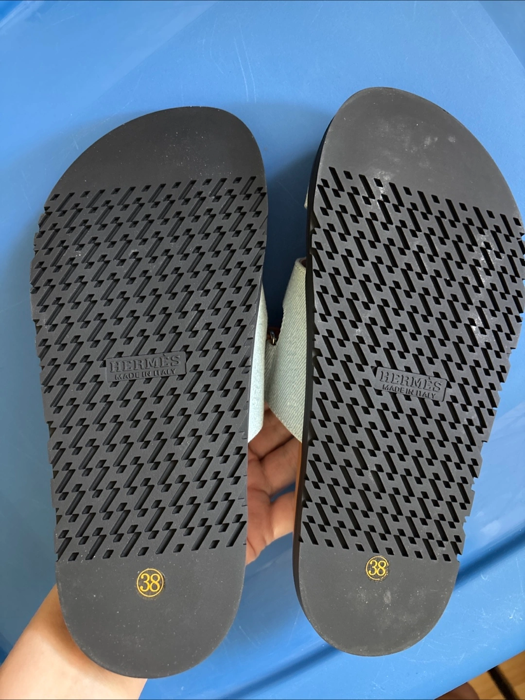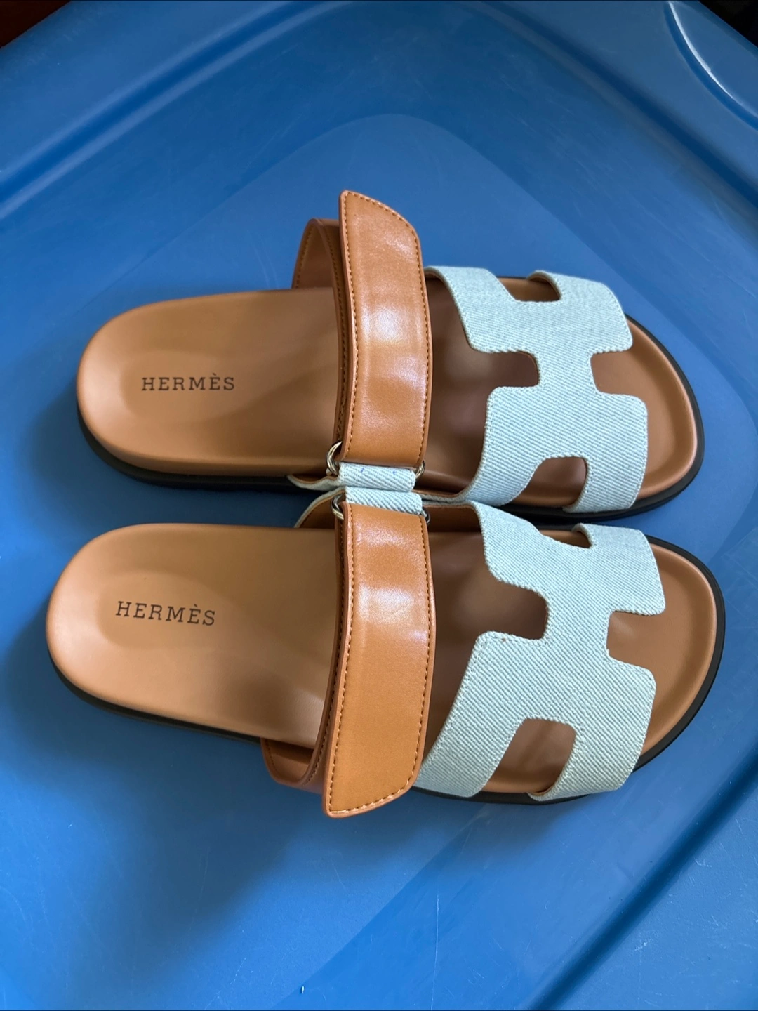 Sandals with an adjustable strap and a large H design. They have a brown footbed and base with a black outsole. A great purchase for summer. Front is light denim. Super chic, highest quality. Size 38 or 7.5. Not real. Come with box.