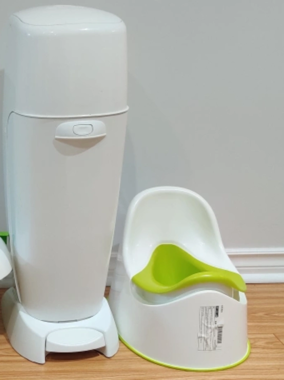 An assortment of baby items. Includes a diaper pail and a potty. You'll love how helpful it is to have these around the house. 1. Playtex Diaper Genie Complete 2. Ikea Lockig potty