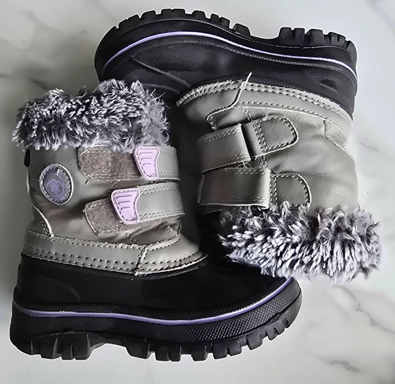 These winter boots look cozy. They come in grey and black tones. They have velcro straps and fur trim. You can keep your kid's feet warm and comfortable on chilly days with these boots.