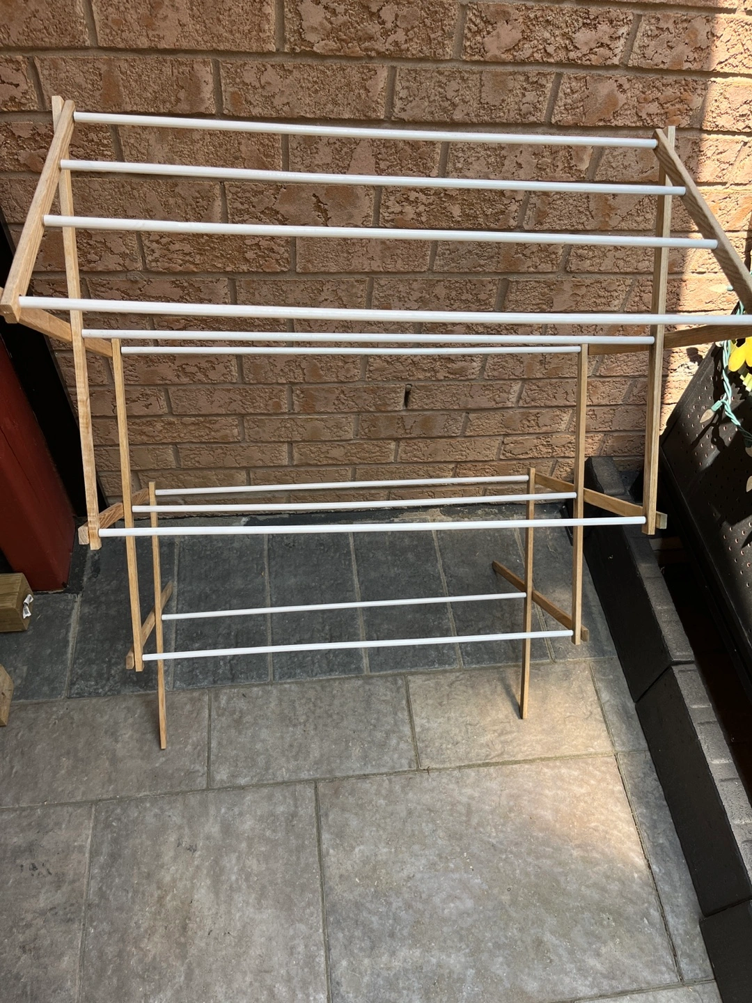 A wooden drying rack. Featuring white bars for clothes to hang on. It also has a lower shelf. You could even use this rack to dry delicate fabrics indoors, letting the fresh air do the work.
