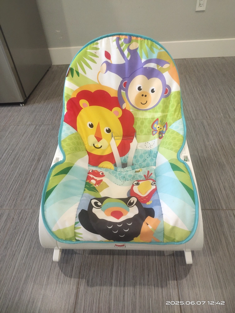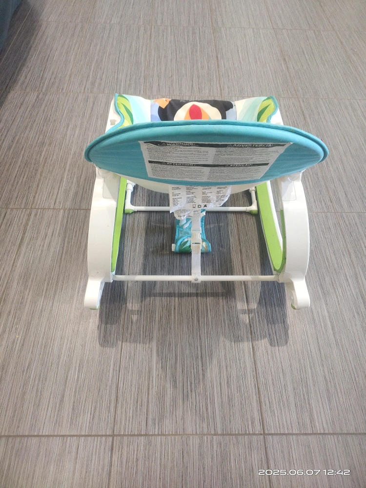 The seat features a colorful design. The infant rocker has a padded seat with a harness. Perfect for keeping baby happy and relaxed. The base allows for rocking.