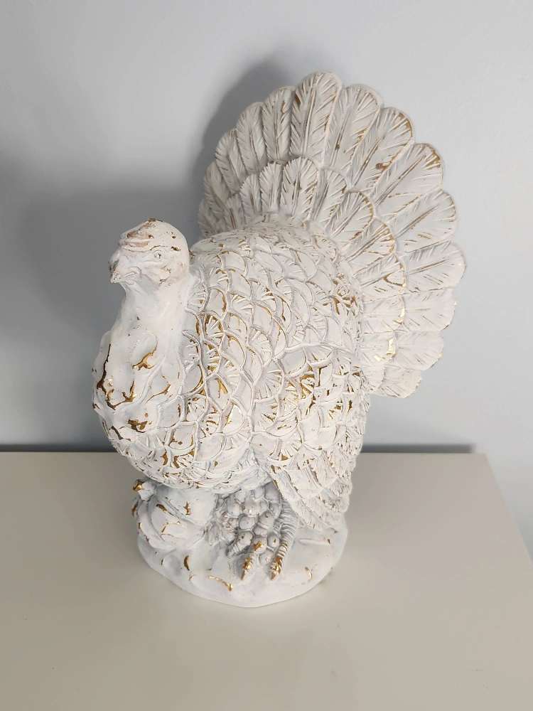 Statue in the shape of a turkey. White in colour with gold accents. Suitable for a mantle or shelf to bring a sense of peace to your space.