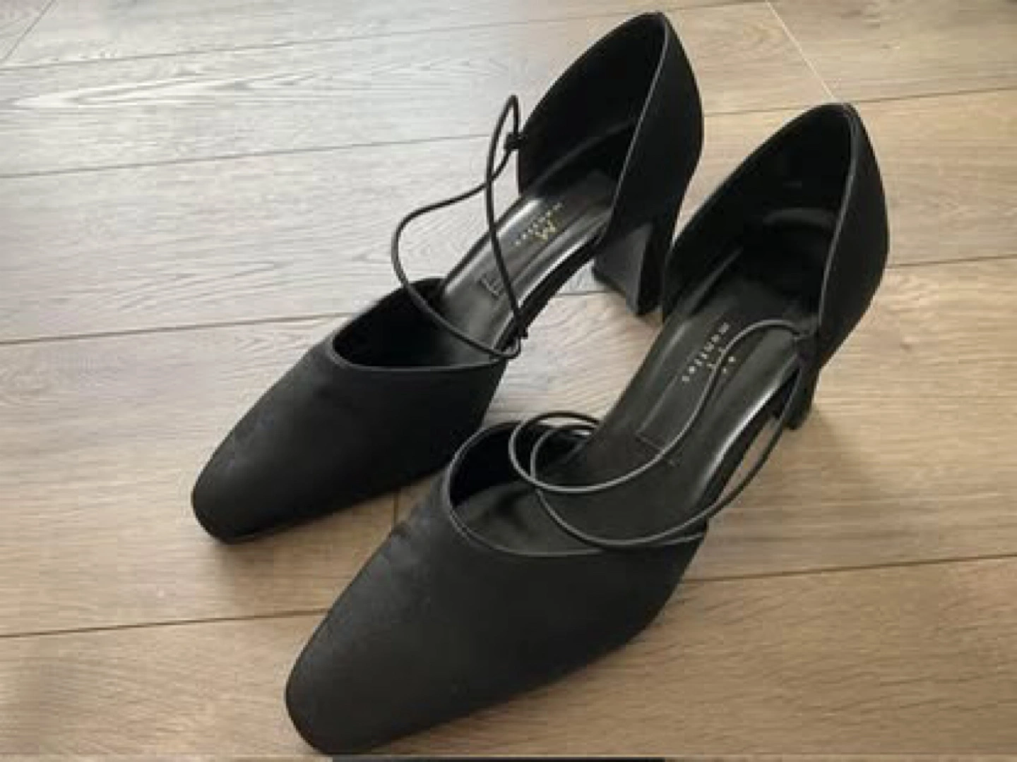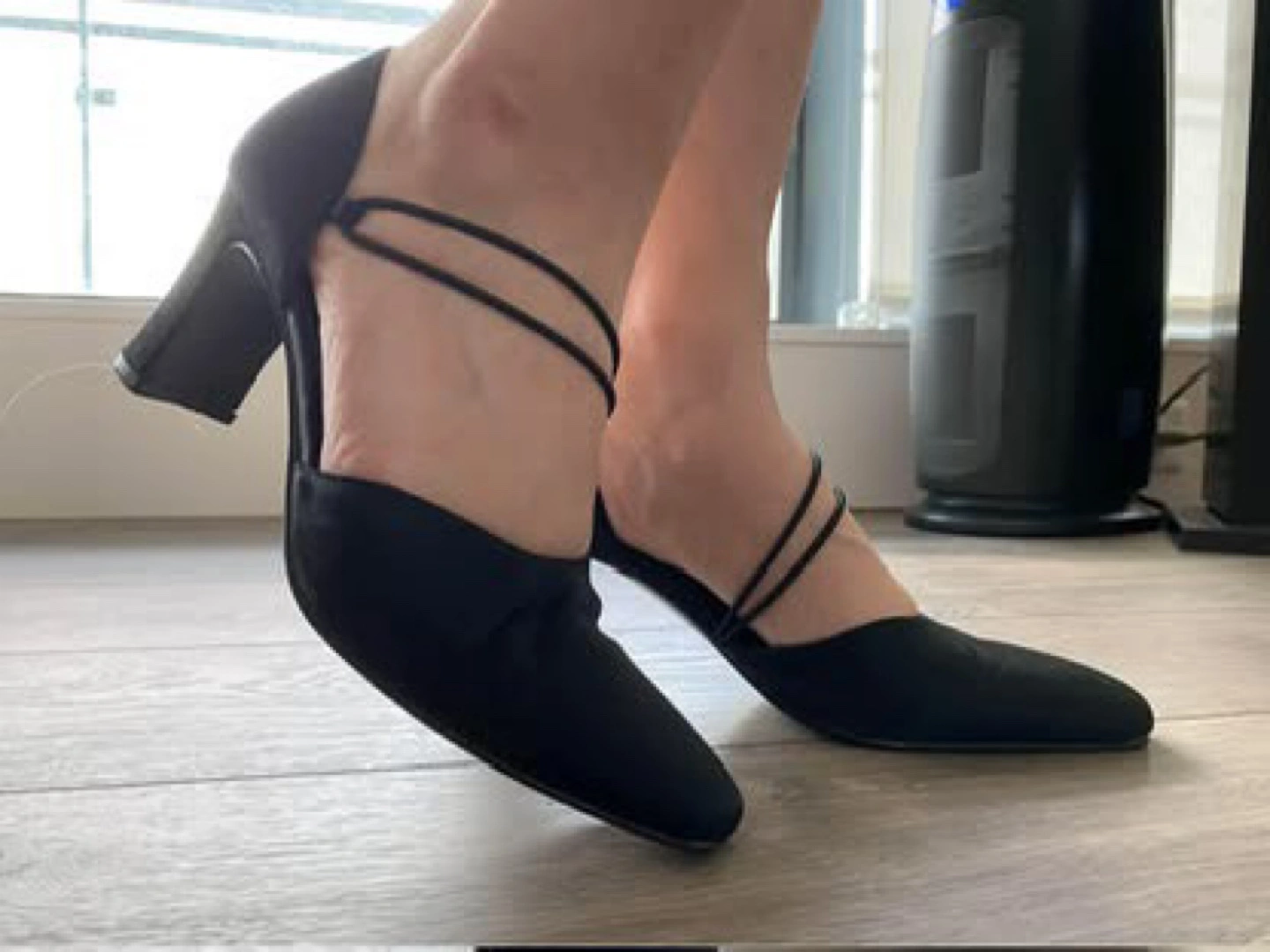 A pair of black heels. They have a low heel. The shoe also has an ankle strap. Perfect for your next special occasion, these shoes will have you feeling comfortable and confident.