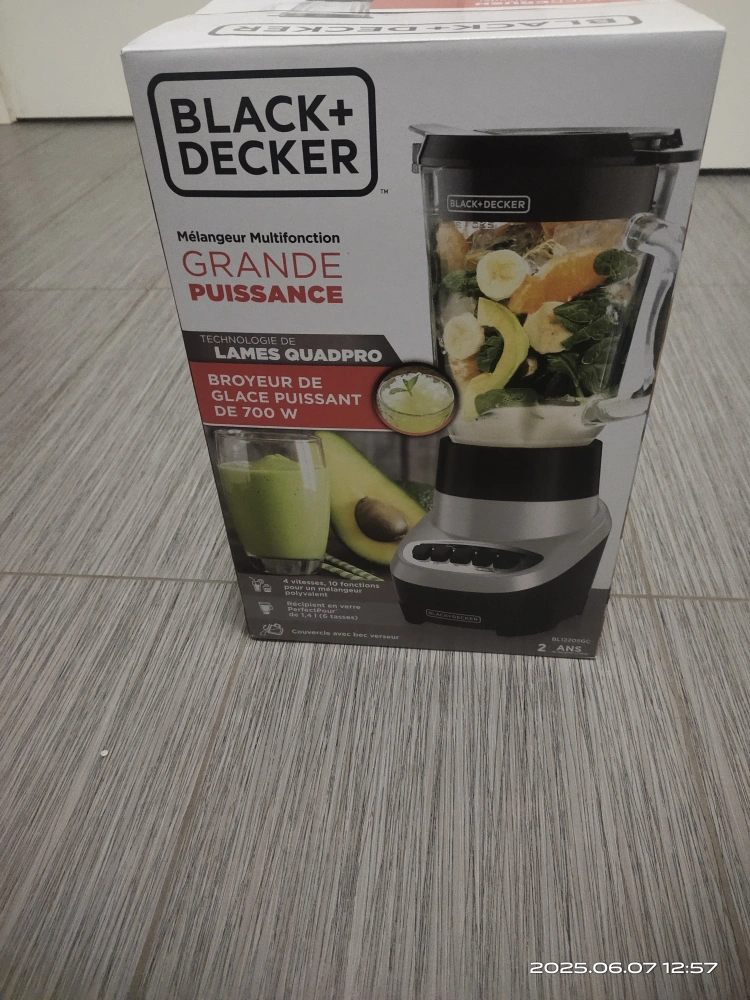 Boxed blender with visible parts. Features a black base and a clear container. Great for blending fruits and vegetables for your daily smoothie or juice. BLACK+DECKER Multi Function Blender with QuadPro Blades in Silver/Black, BL1220SGC Selling as I already have two of this. It's 63.99$ on Amazon. 38+ on Walmart.