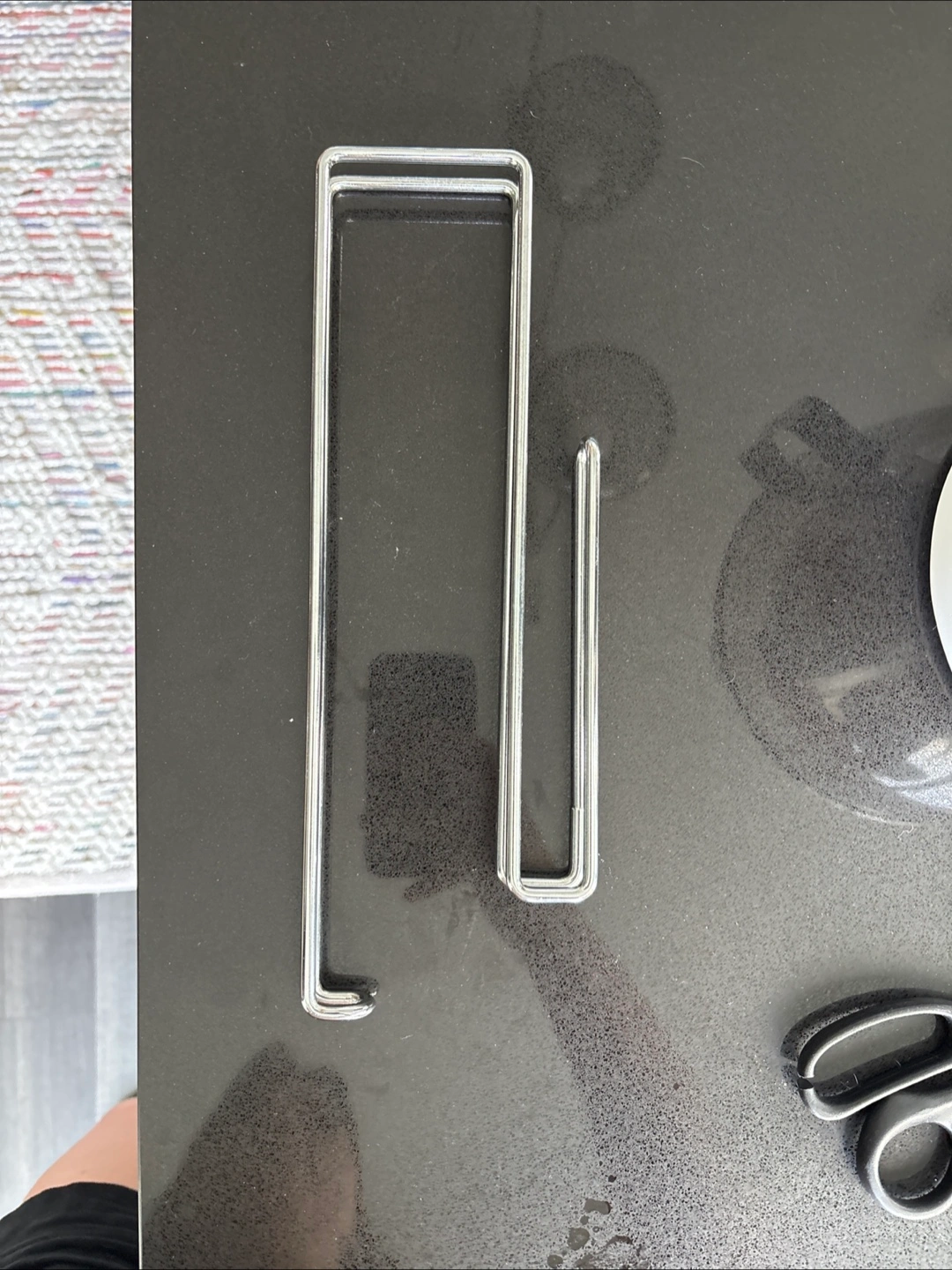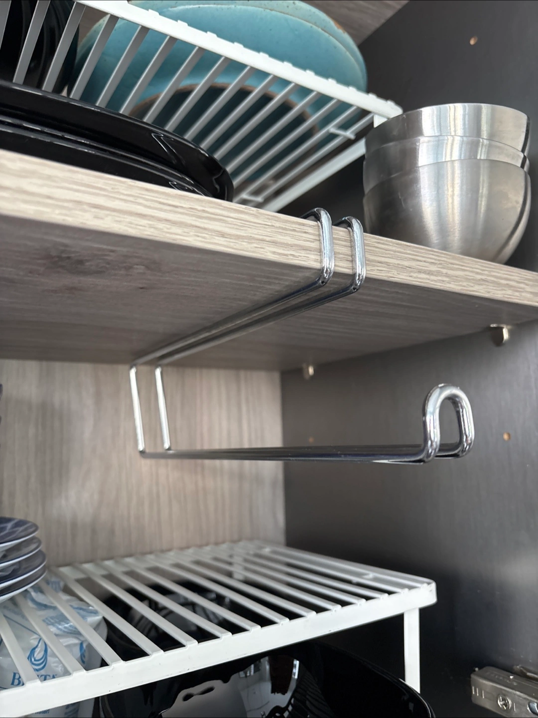 Hook for hanging paper towel or other things of pre-existing shelves. No drilling required.