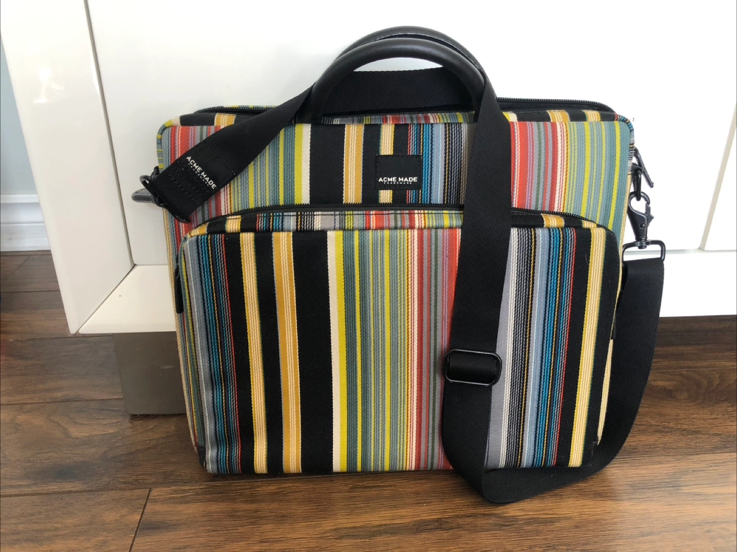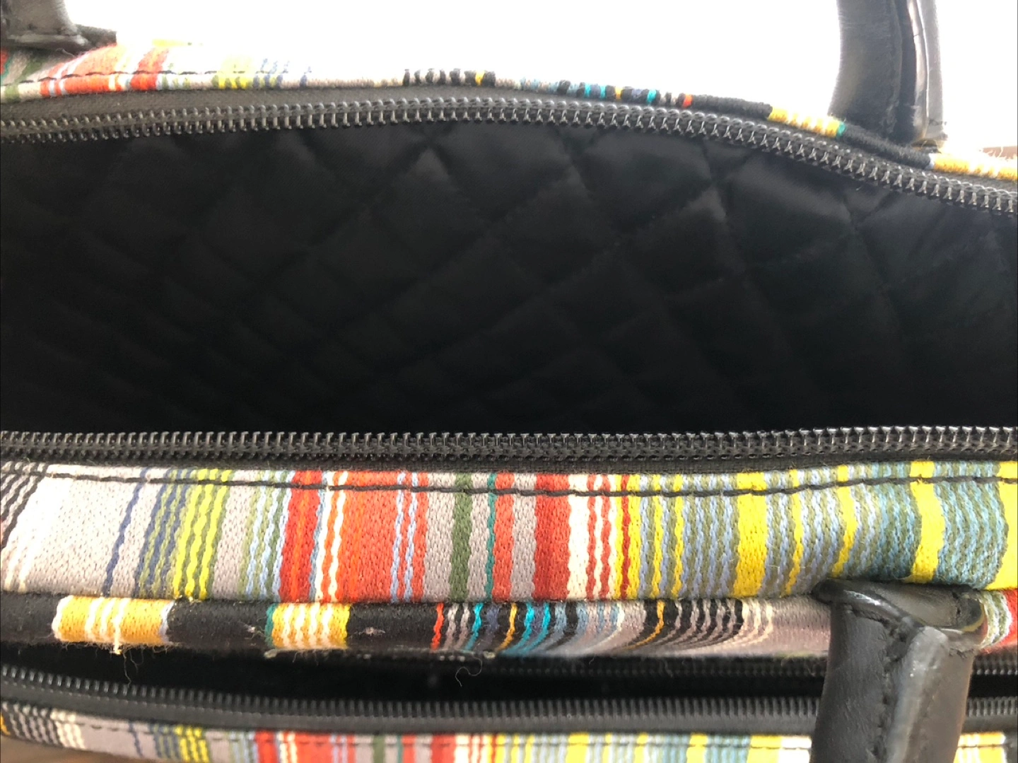 The bag features a colourful striped pattern. Includes a handle and a detachable shoulder strap. Inside is quilted and there are pockets. You can carry this stylish bag with you when you're on the go. Never used.