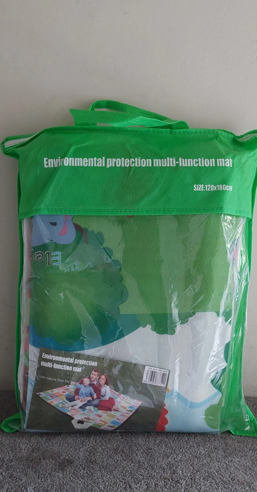 A large, multi-function mat. Comes in a carrying bag. The mat appears to have a colourful cartoon design. Imagine yourself relaxing and connecting with nature on this mat.
