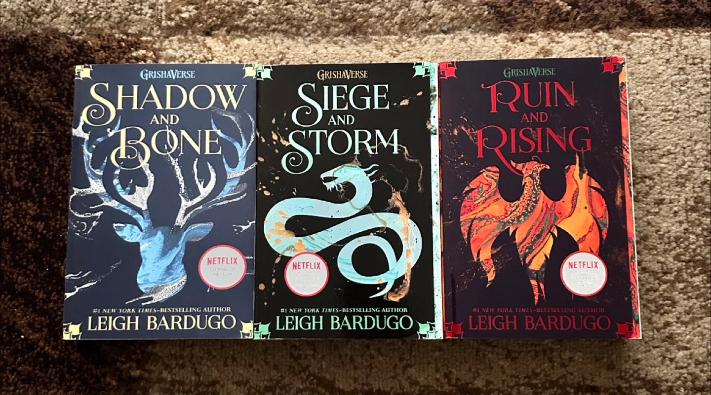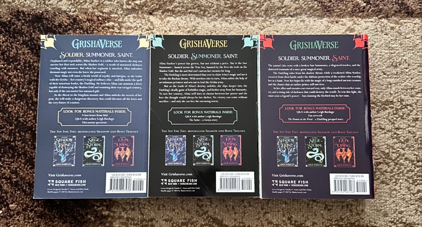 A series of soft cover books, ready to be explored. The covers have eye-catching art. The books are written by Leigh Bardugo. These books are great for a relaxing evening. Spines are in perfect condition and pages have no creases or rips. Smoke free home.