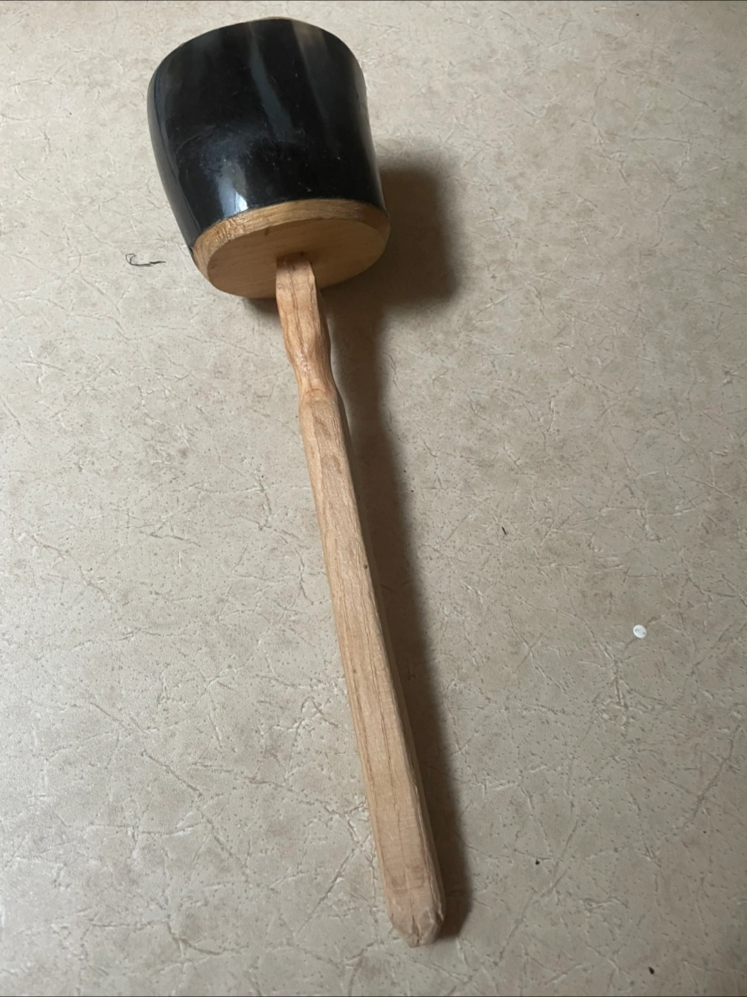 A lovely wooden mallet. The handle is made of a light coloured wood, leading to a wooden base. The head of the mallet is dark, possibly ebony. Use this mallet to feel a connection to the past or make music