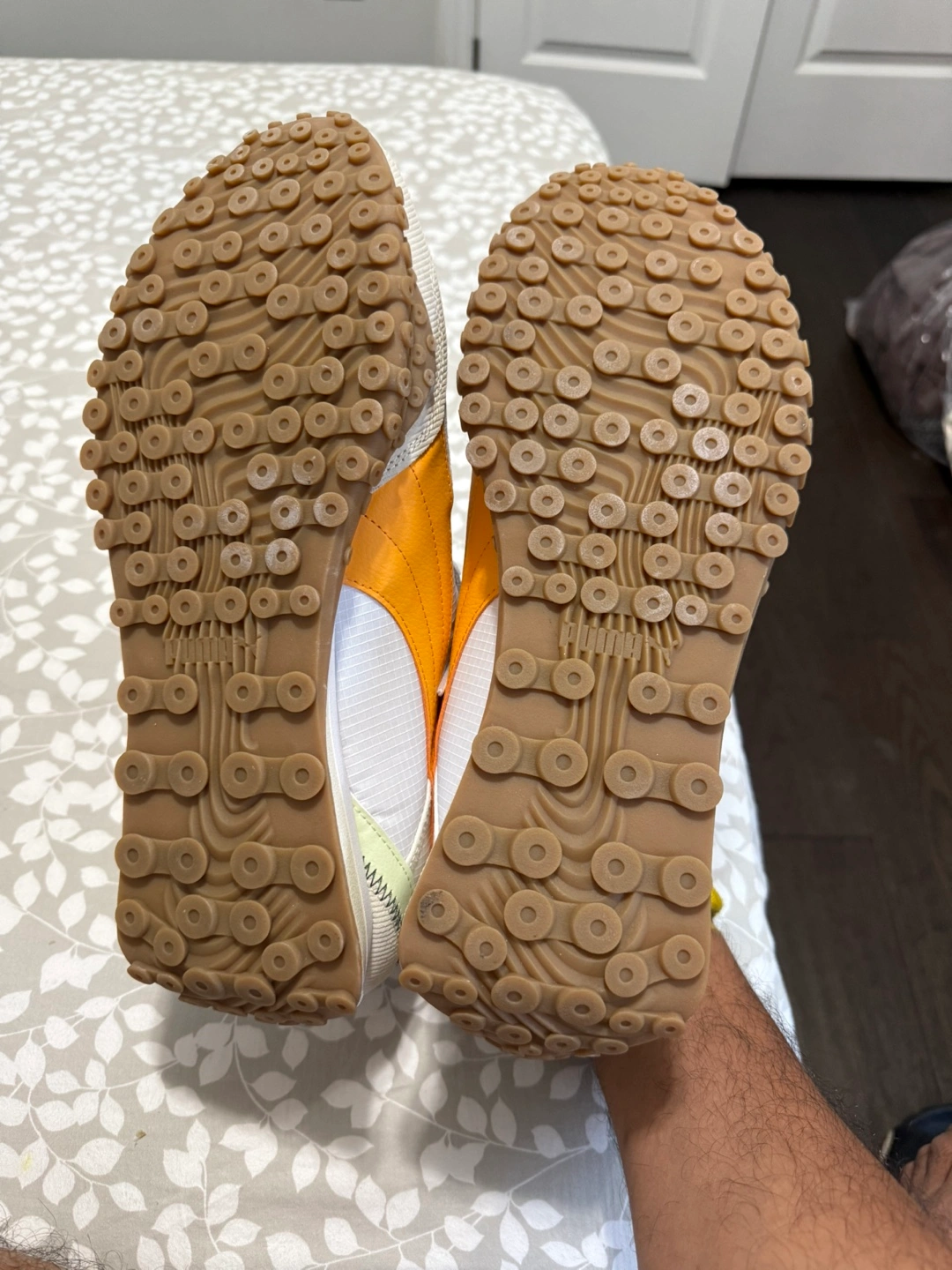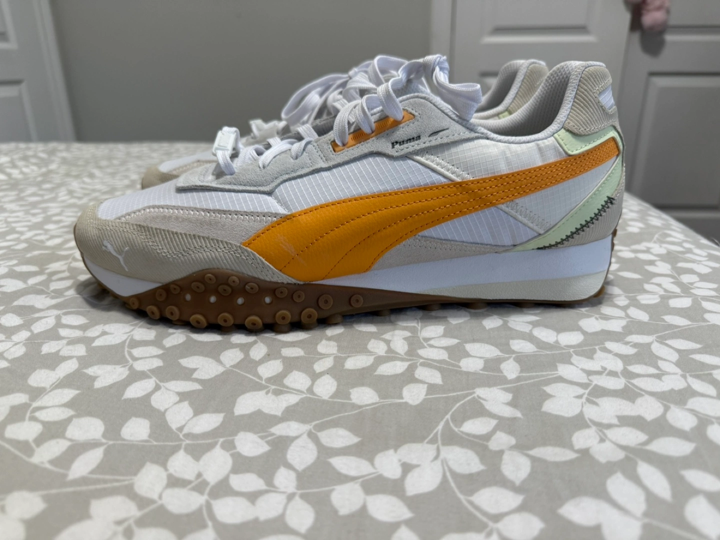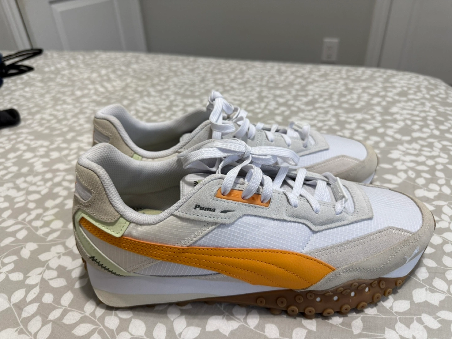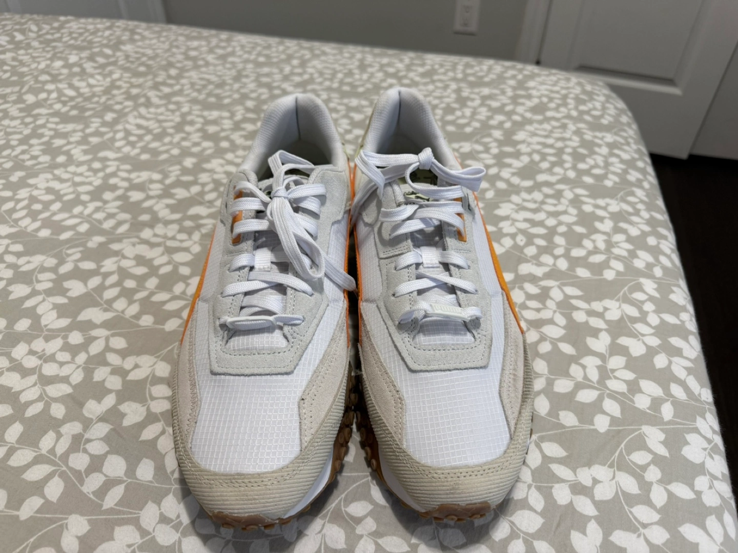 Brand new sneakers feature a white and orange colour scheme. The shoes have white laces. The soles are brown. Walking in these sneakers could be a good way to explore new places.