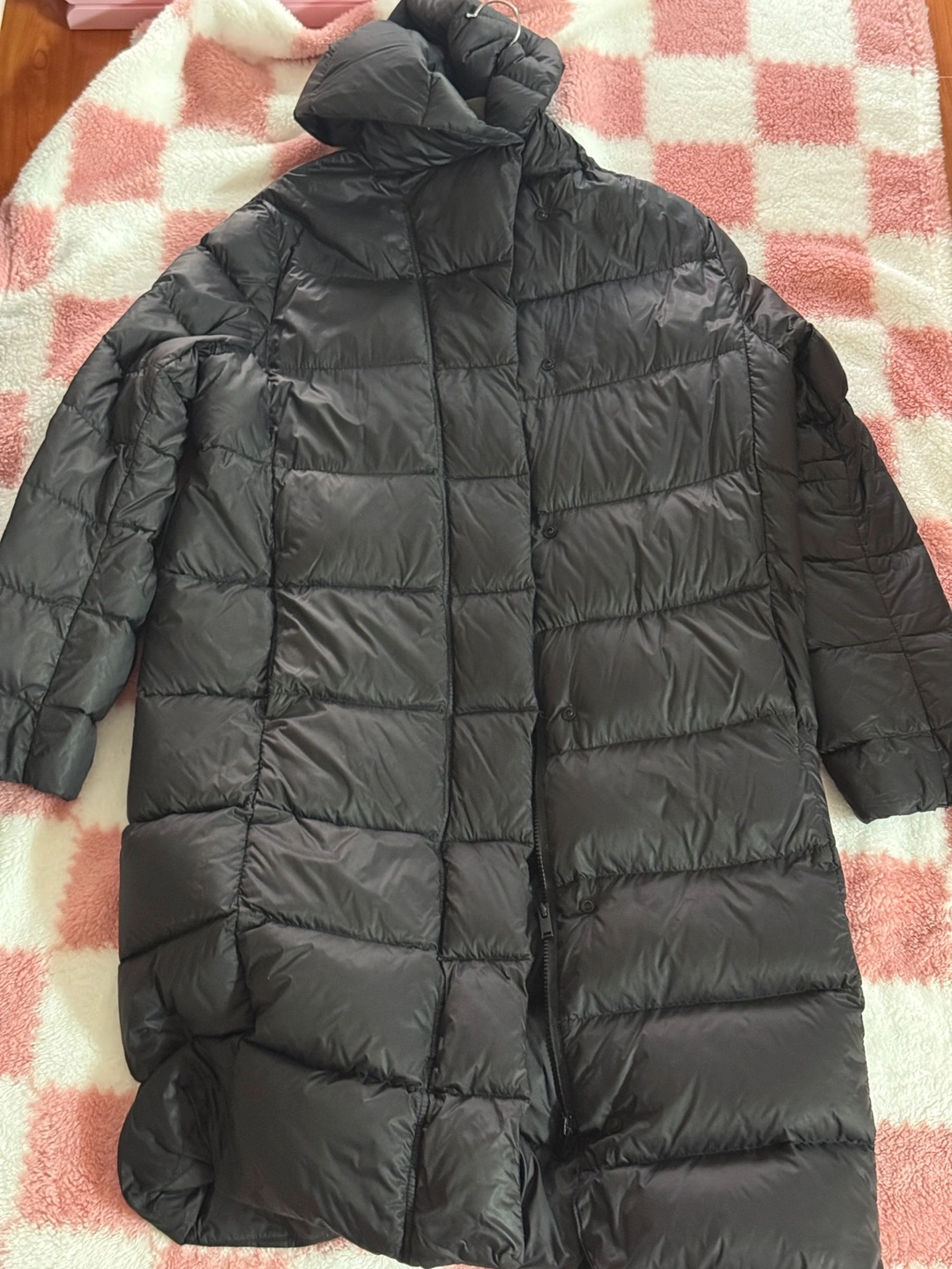 Long black puffer coat with a hood. Has a blemish at the back, pic 3