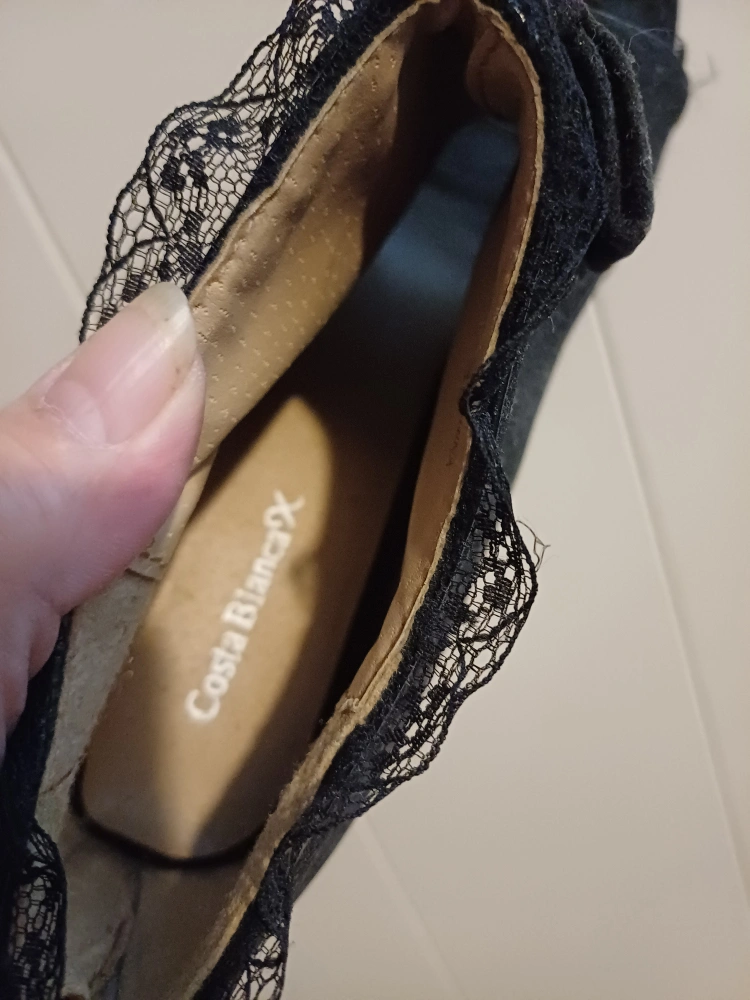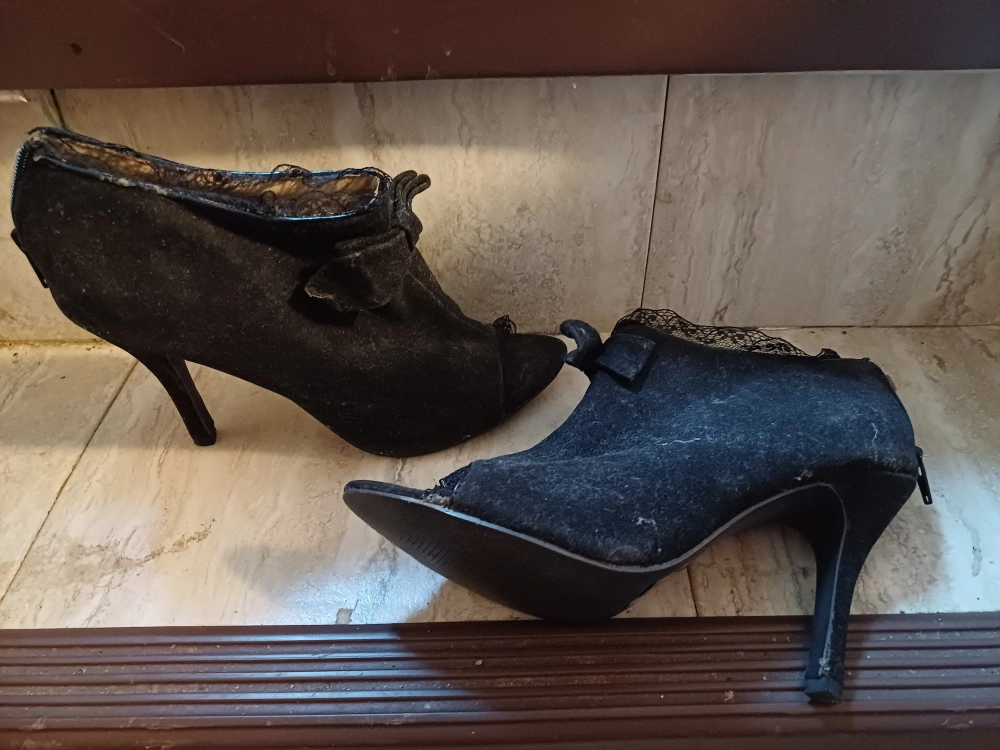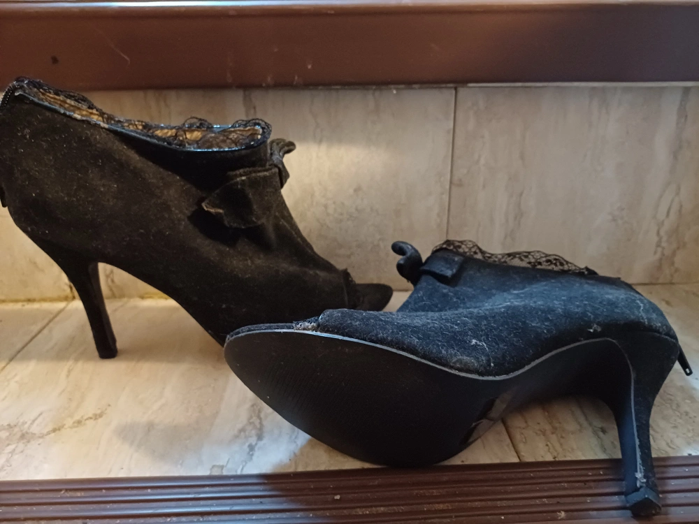 FREE shoes: Pair of black heels. Features a pointed toe with lace detailing. Bow detail on the side.