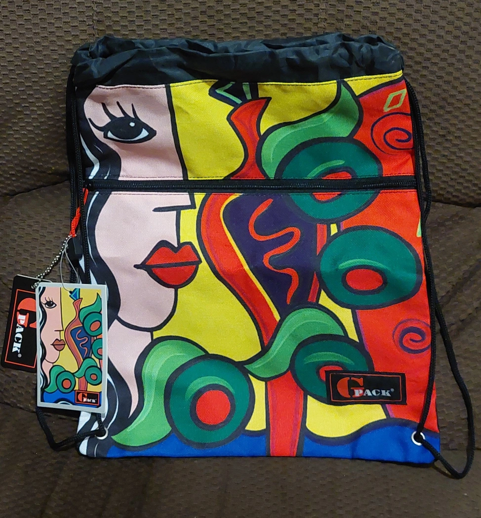 A colourful drawstring backpack. Black at the top and back. Features a zip pocket. Perfect for carrying your essentials for a relaxed day out.