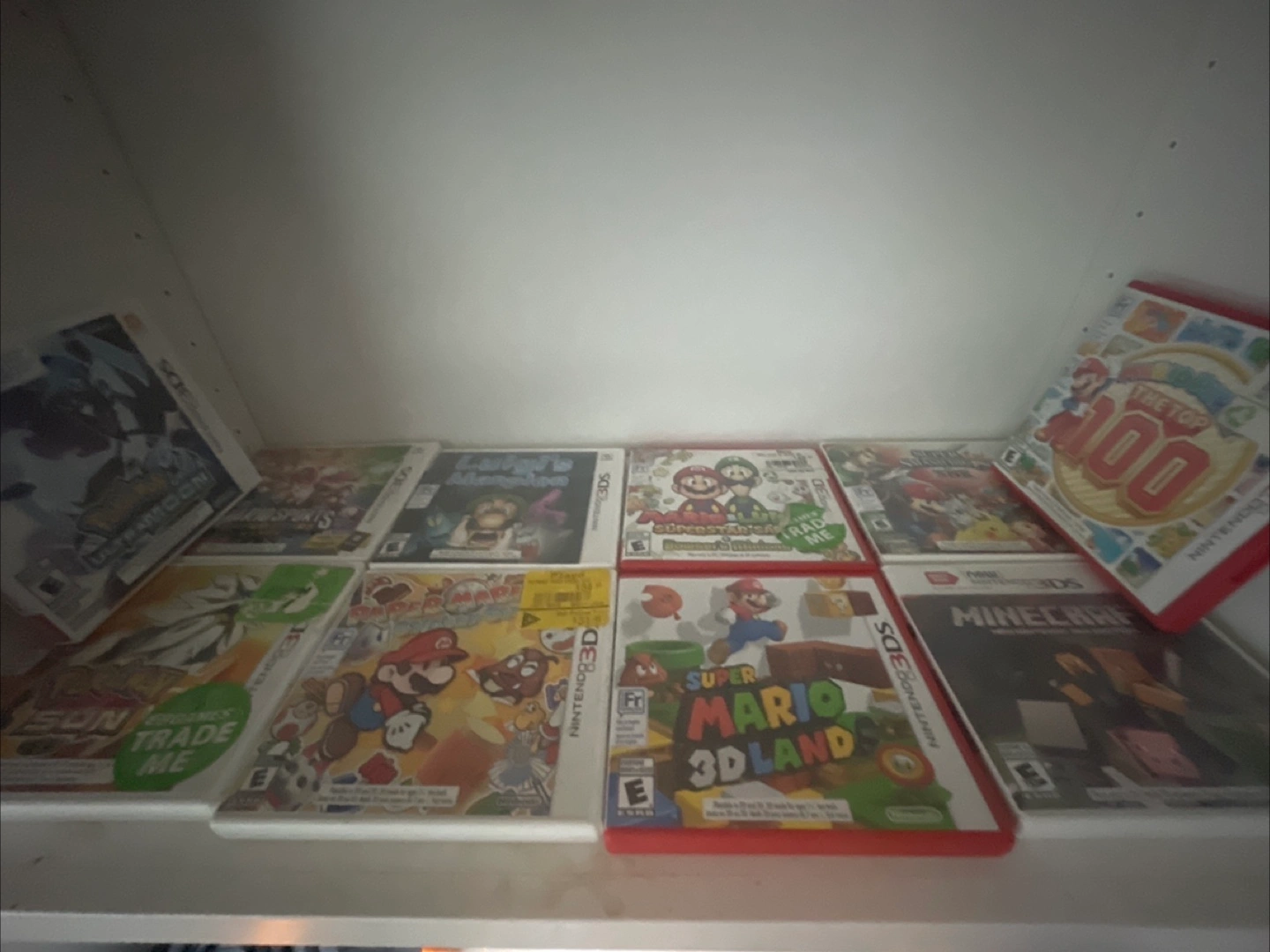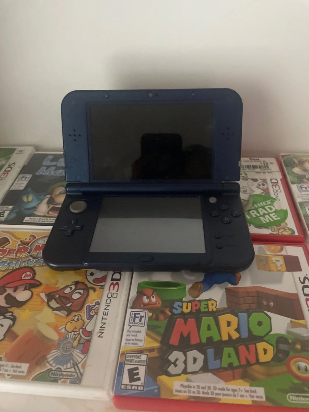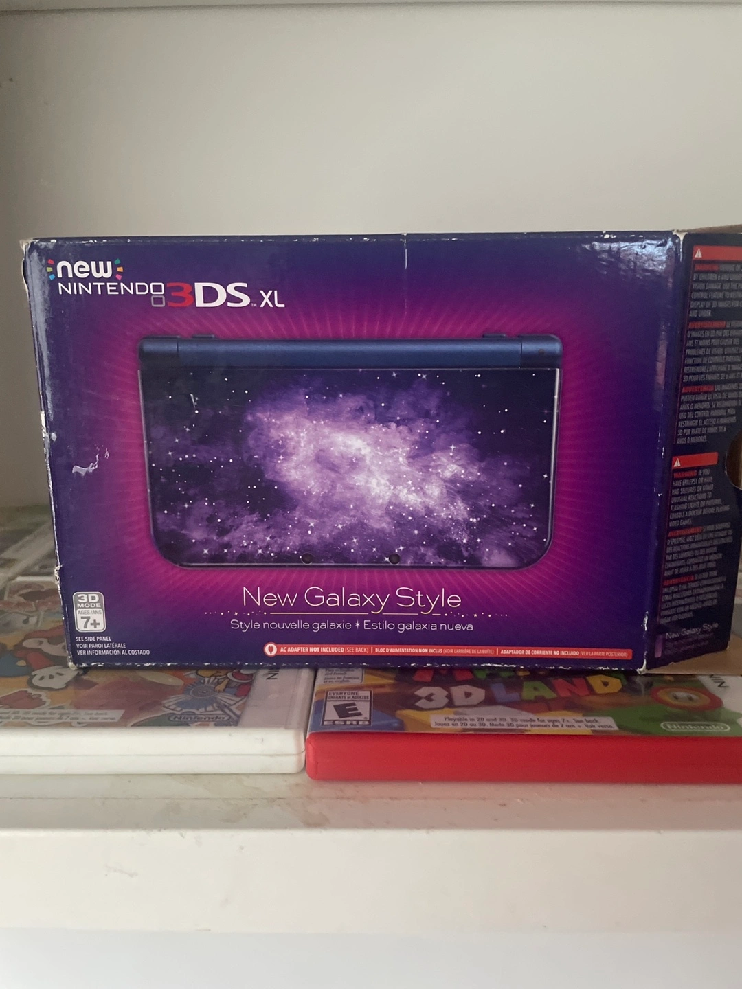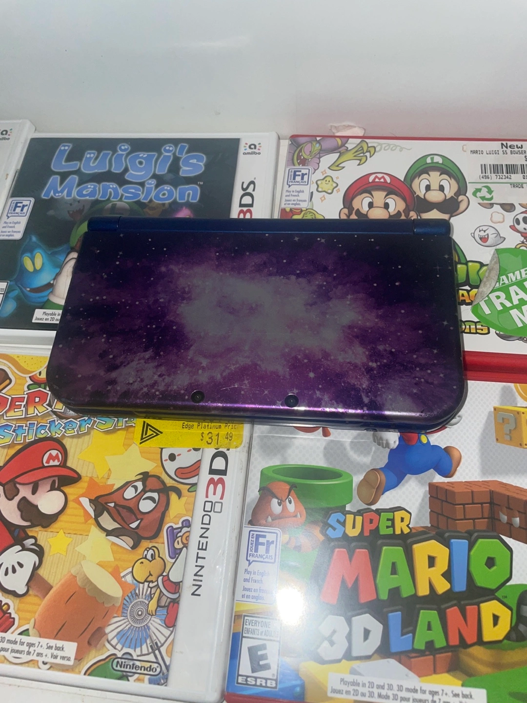 -6A collection of Nintendo 3DS games, as well as a console. There are games with Mario characters, as well as other games. The console has a purple space themed design. Consider these games to relax after a long day. Box is a little damaged.