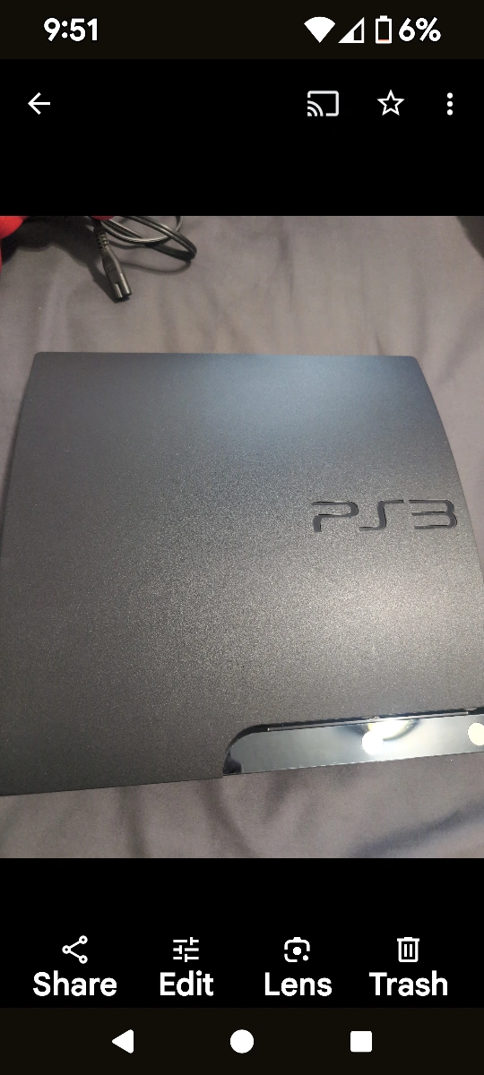 A black console, appears to be a Playstation 3 slim . A great way to unwind after a long day. It is included cords and wires.perfect condition like new.used few months only .