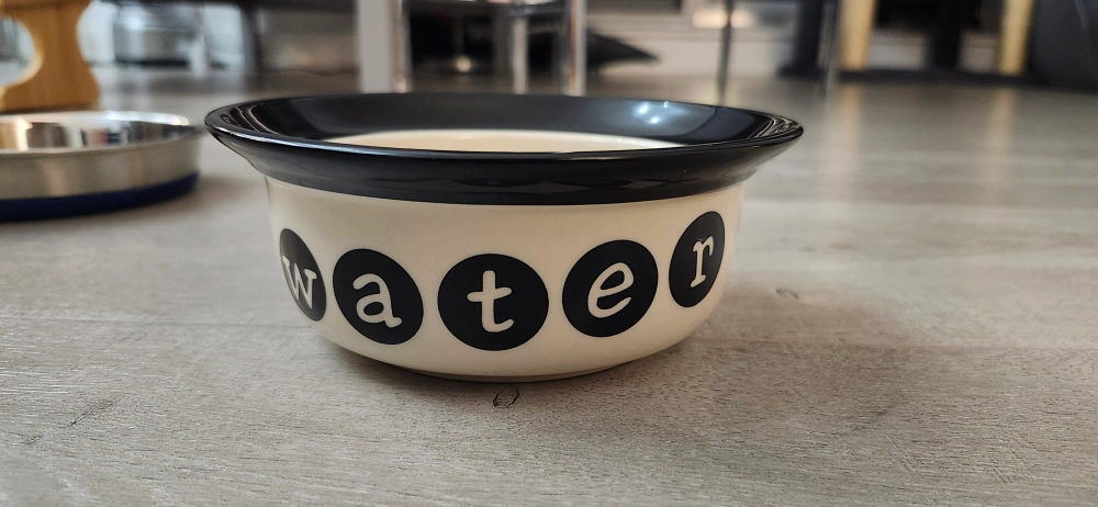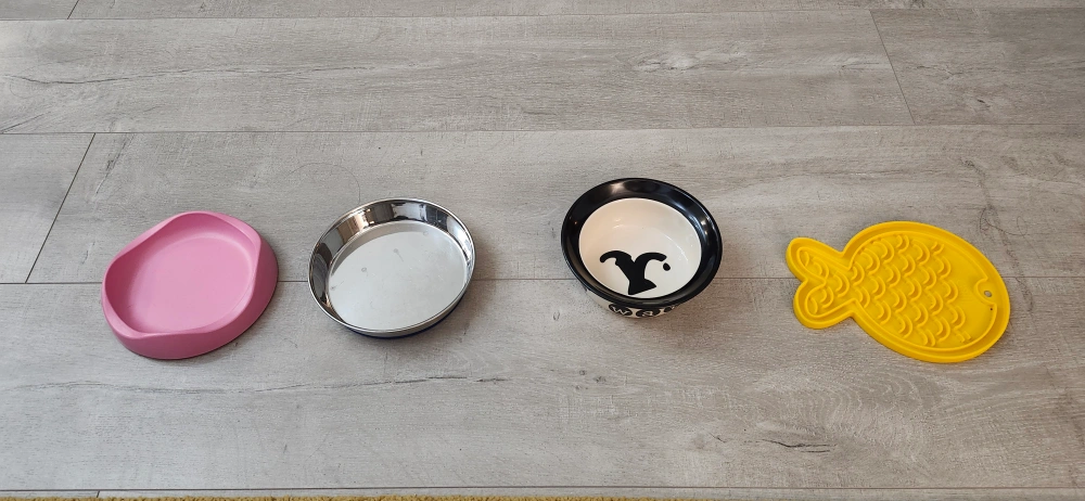 21Food and water bowls for cats or dogs. 1. Pink bamboo shallow bowl with wavy edge - great for cats who get whisker fatigue 2. Stainless steel shallow bowl 3. Stoneware water bowl 4. Yellow plastic lick mat - great if your pet loves wet food but eats too quick $5 each