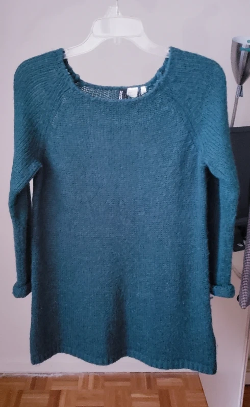 Teal-coloured dress-like sweater. Has long sleeves. The neckline is a scoop neck. Barely worn ‘cos it's not really my color 😉 Excellent pre-owned condition pick up at my place or Islington Station