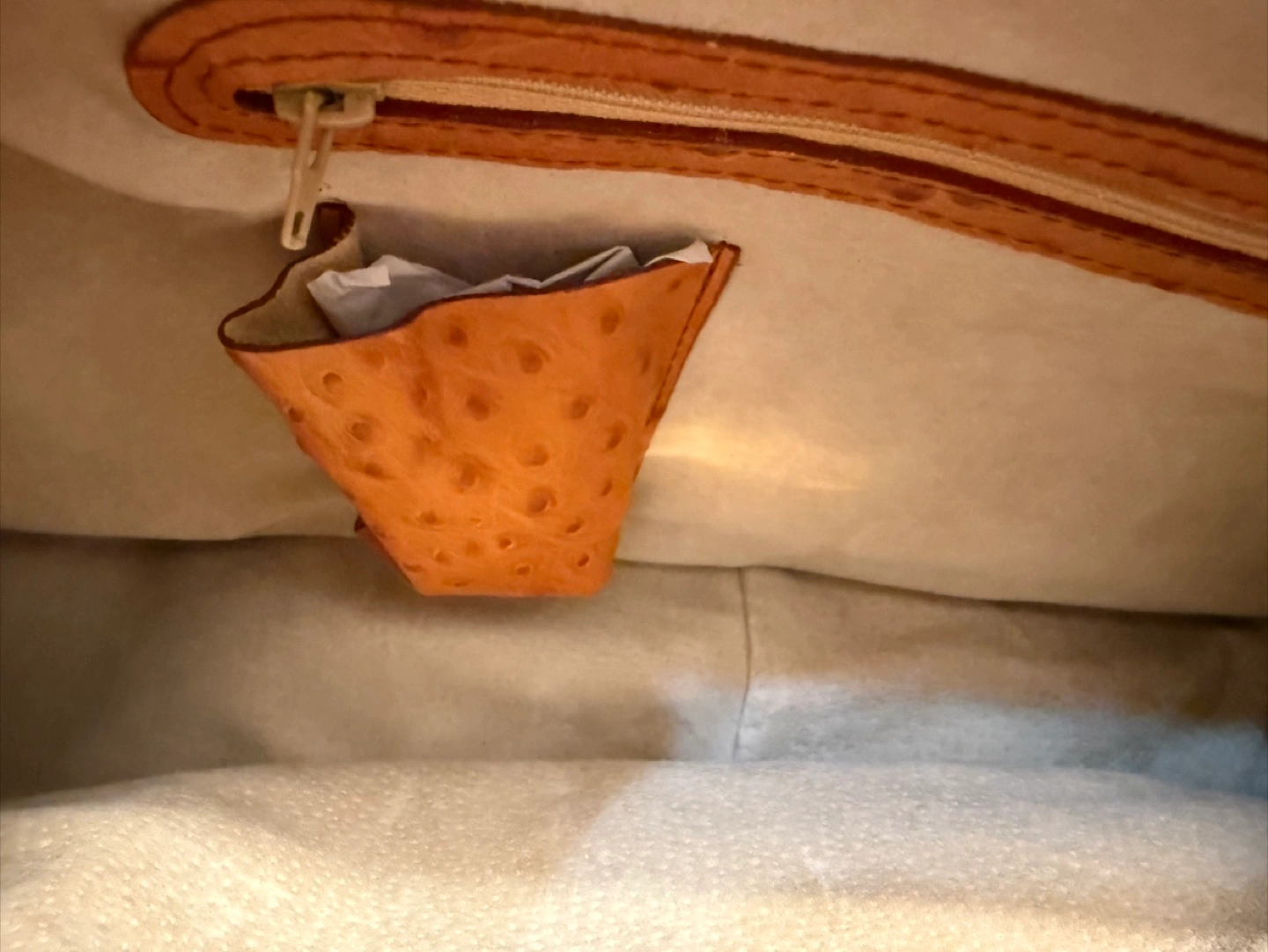 Warm cognac/tan leather exterior with natural pebbling
