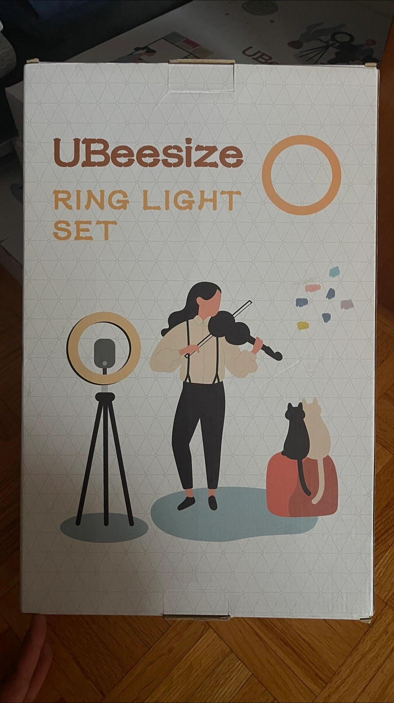Boxed ring light set. Appears to include a tripod stand. It may be an ideal piece of equipment for creating a calming atmosphere during video calls and recording sessions.