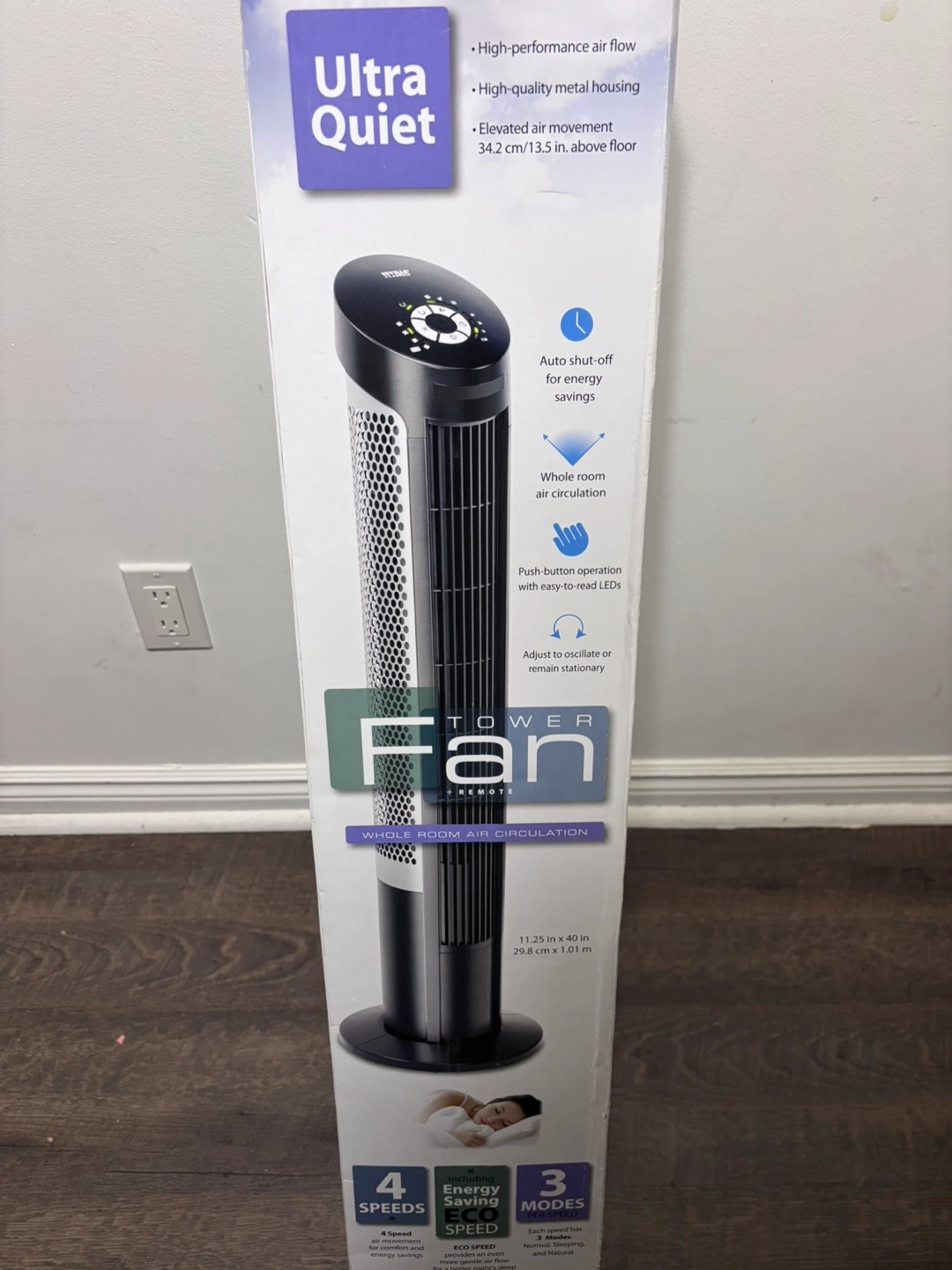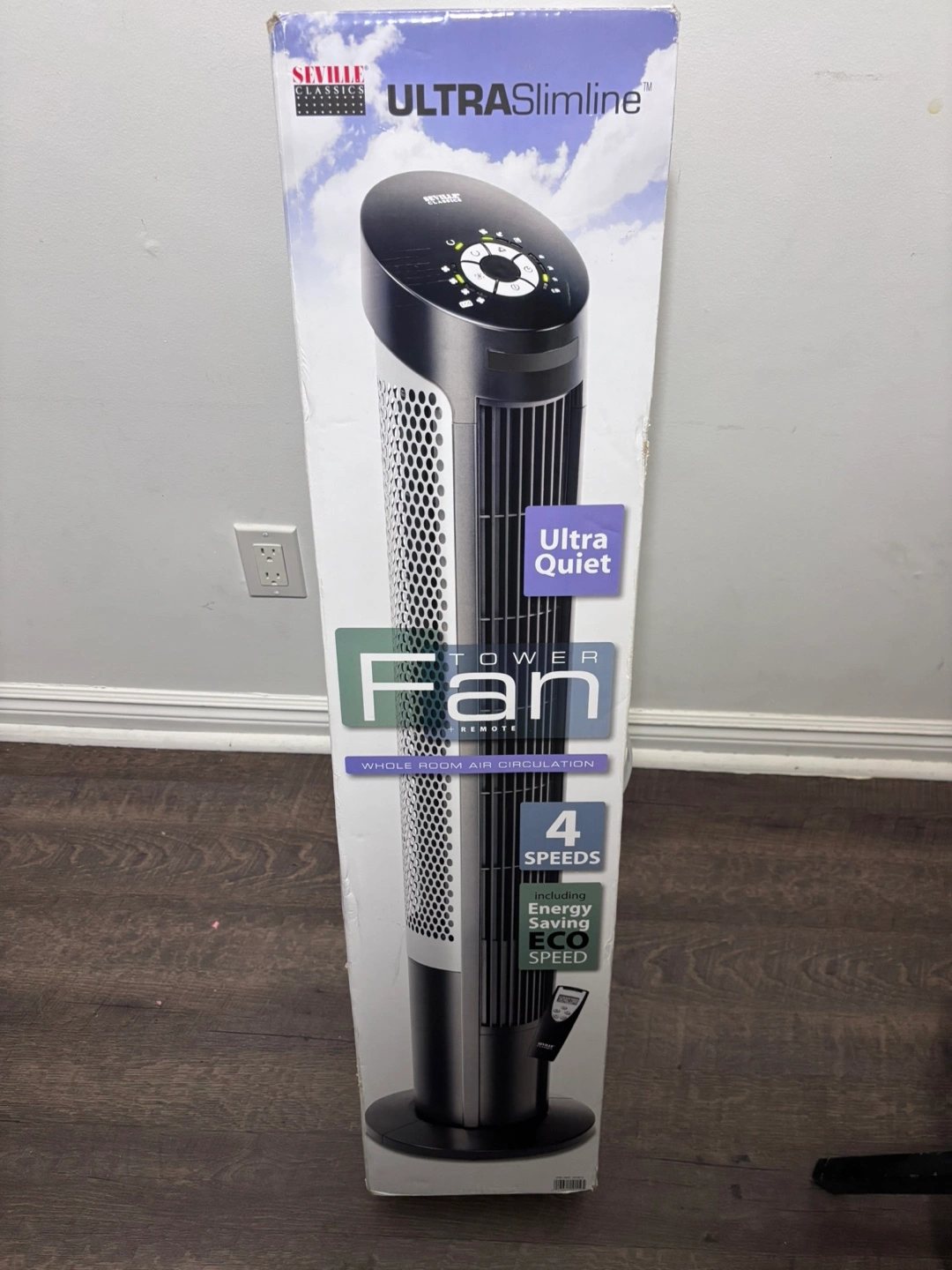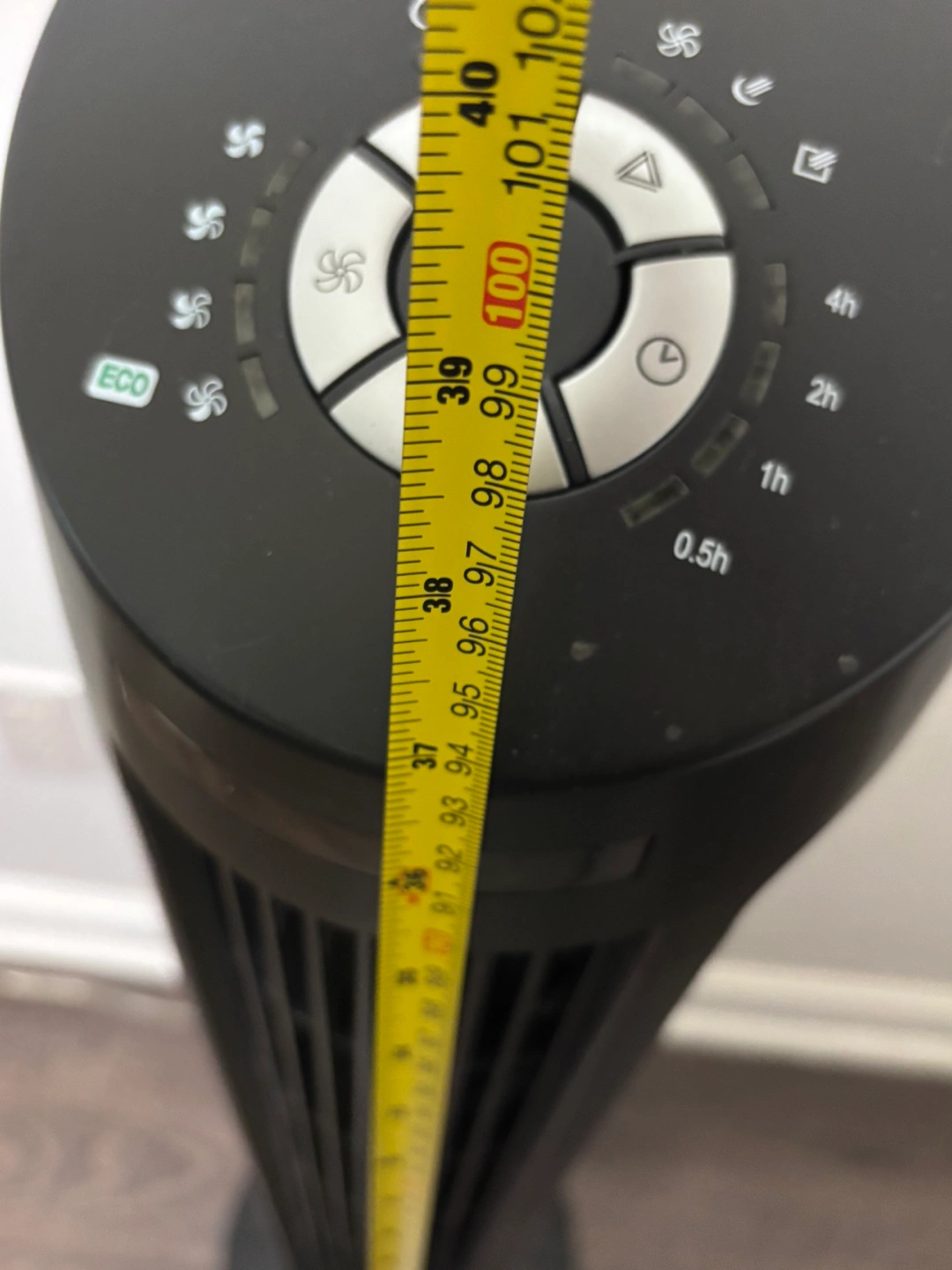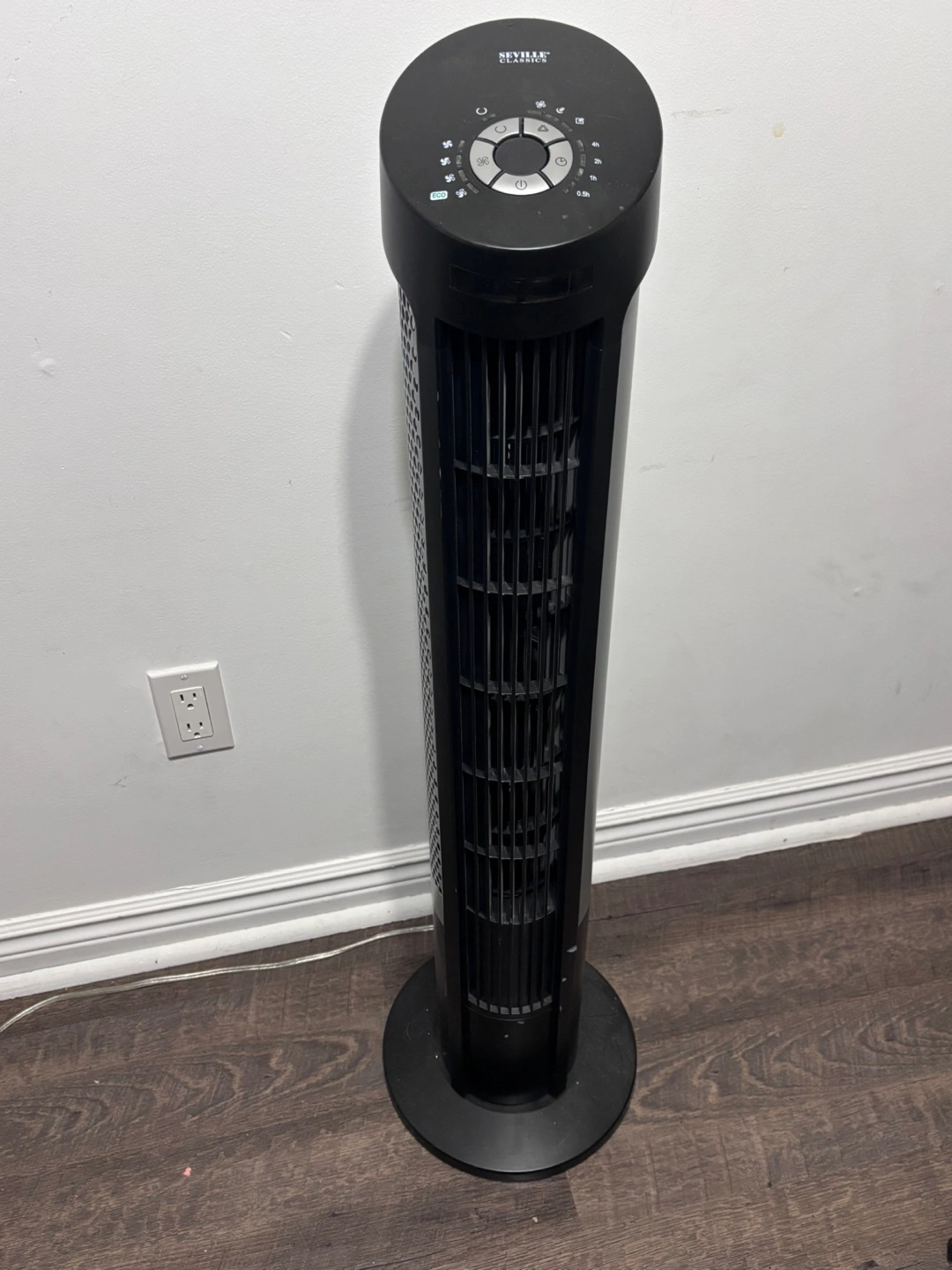 Tower fan, perfect for a bedroom or living room. Black colour. A slender design. Features digital controls. This fan can help create a peaceful atmosphere.