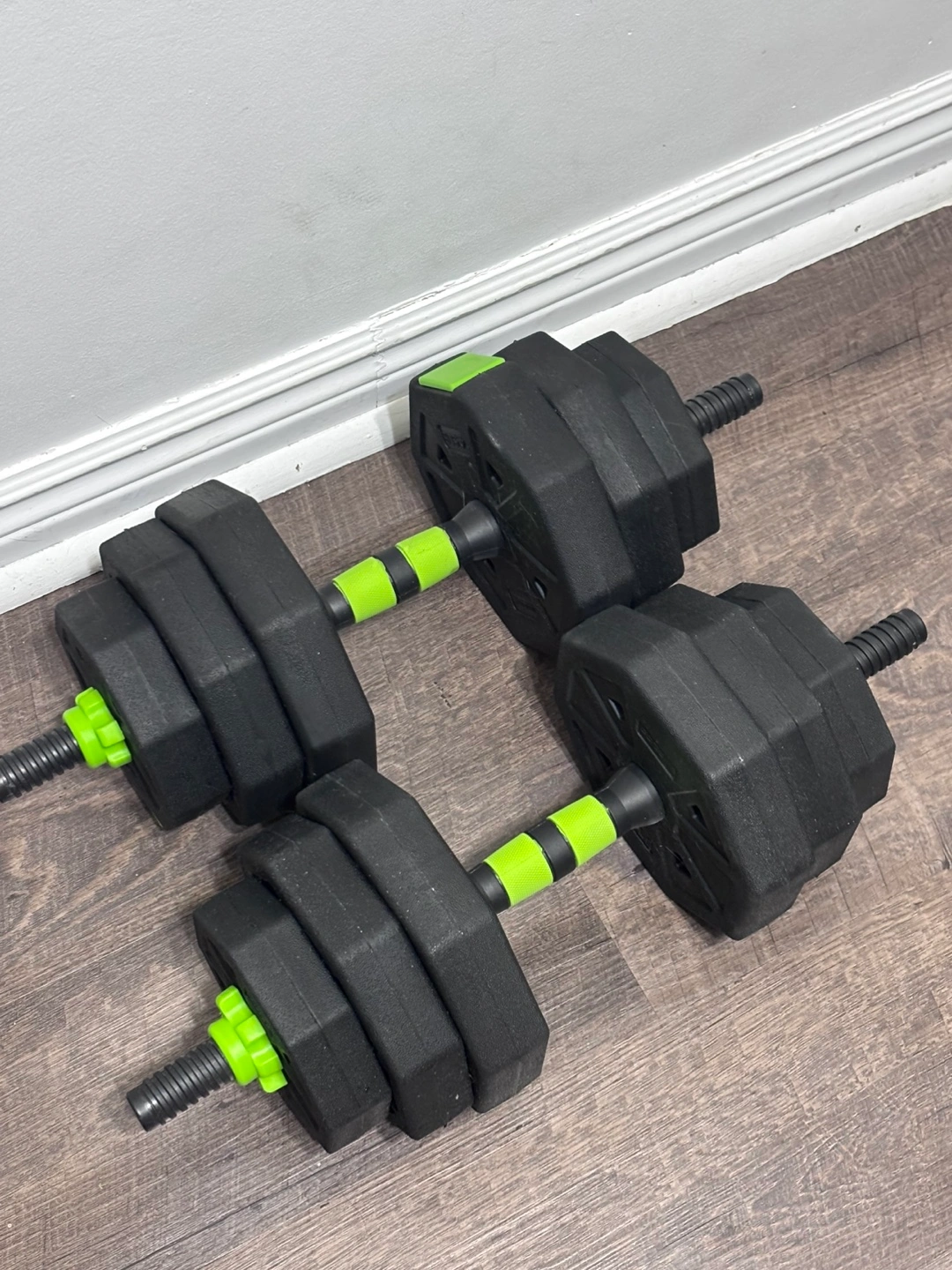 The dumbbell set is adjustable with weight plates. It features dumbbell handles and a barbell connecting rod. Great for adding some movement to your day.
