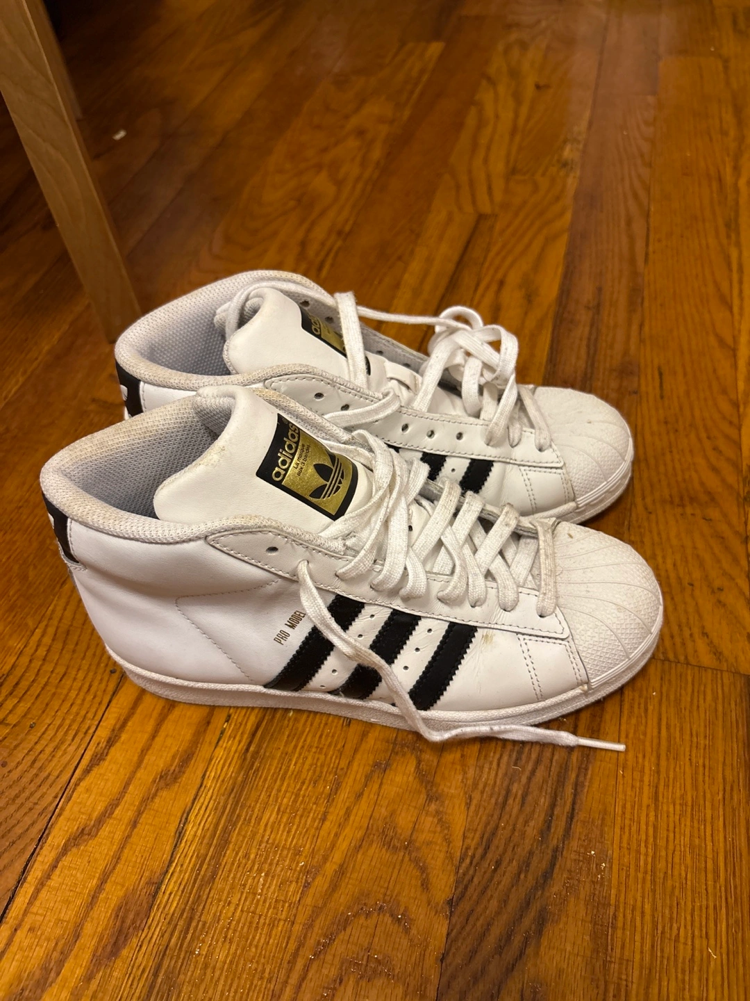 A pair of white high top sneakers. Features the signature three stripes on the sides. The back has a logo. These shoes would look amazing on a nice day out.
