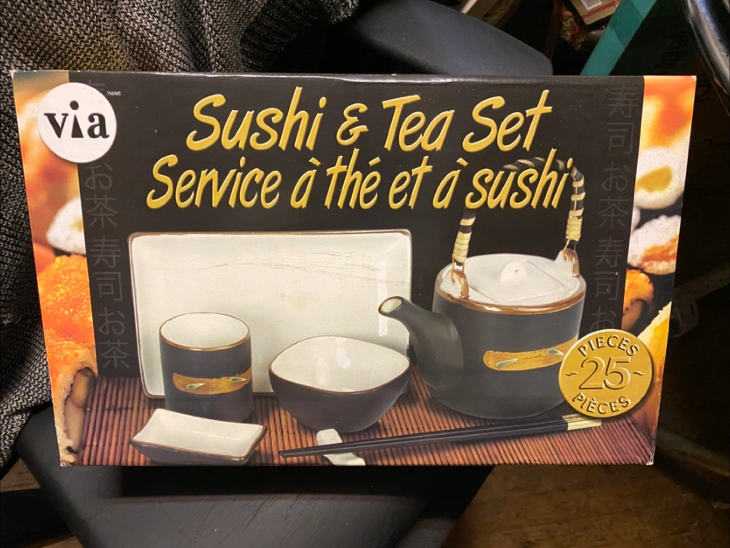 Includes a teapot with a woven handle and a lid, 4 cups, 4 square bowls, 4 rectangular plates, 4 soya sauce dishes, 3 black Japanese chopsticks (missing one pair), and 3 chopstick rests (missing one).