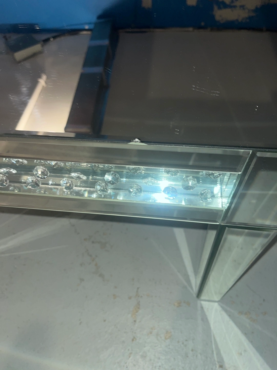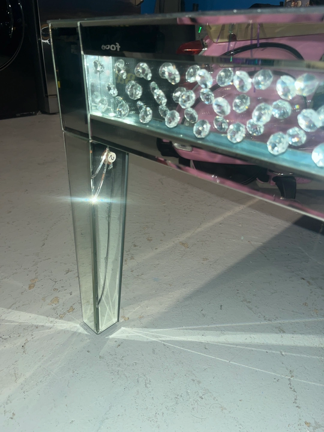 Mirrored coffee table with decorative accents. Legs are mirrored. A great piece to add a touch of elegance to your space. Open for any offer leg is broken and a couple of scratches on top smoke free home