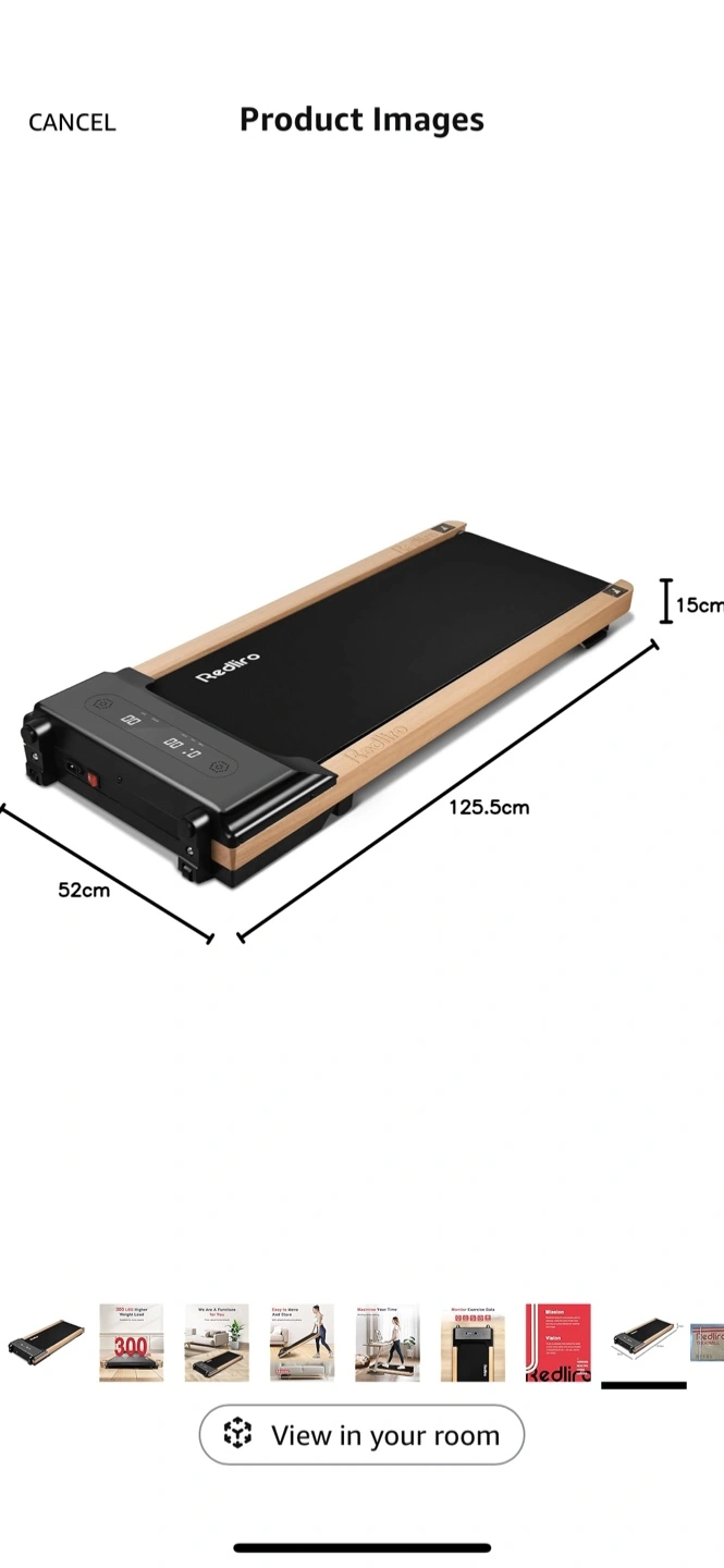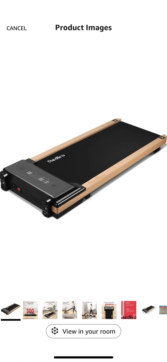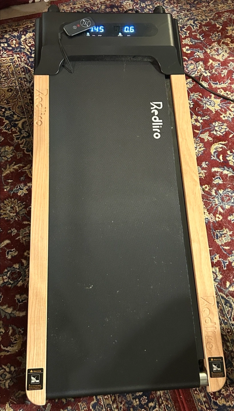 Walking treadmill with a sleek and modern design. Black walking surface, with light wood trim. Digital display on the front. This walking treadmill is perfect for incorporating some movement into your day while you work.