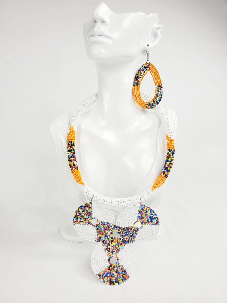 A beautiful Hand-beaded jewelry set featuring a necklace and matching earrings from Kenya. The Mainly white set is handmade with tiny, colourful beads. A great statement piece for adding a touch of artistic flair to any outfit.