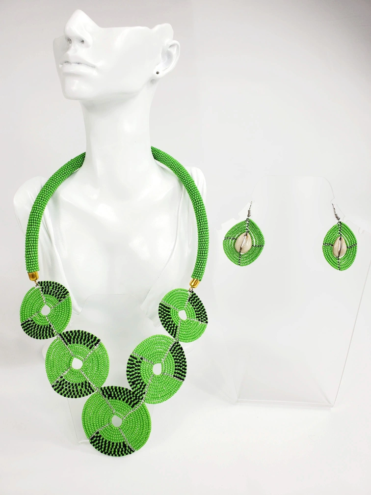 African Hand-beaded necklace and earrings set from Kenya. . I offer you a set of beaded necklace and earrings. The bright green beads on the necklace are a beautiful accent contrasted by a few black beads. The earrings are adorned with cowries. I'm sure this set will brighten your day.