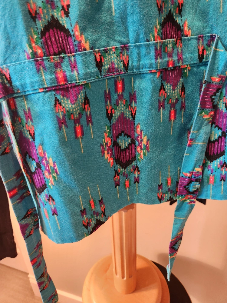 size medium/large colorful one of a kind homemade vest, featuring an south western print design. The vest is accented by a contrasting dark fabric and two buttons. It's perfect for adding a unique touch to any outfit, or just to add a bit of flair to your day. Just in time for Indigenous peoples day!