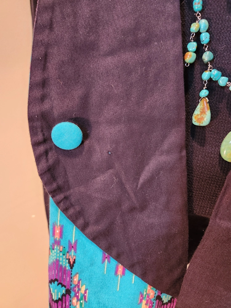 size medium/large colorful one of a kind homemade vest, featuring an south western print design. The vest is accented by a contrasting dark fabric and two buttons. It's perfect for adding a unique touch to any outfit, or just to add a bit of flair to your day. Just in time for Indigenous peoples day!