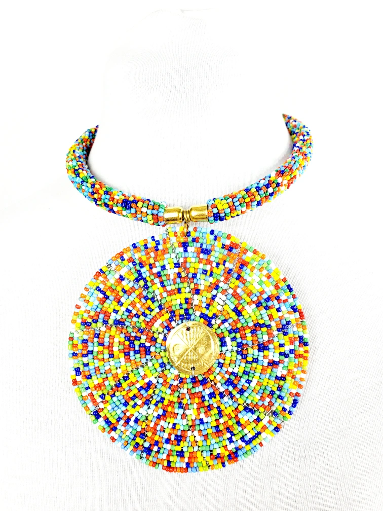Beautiful handmade African necklace with multicolored beads and brass parts. It features a colorful design with a large circular beaded pendant. An ideal accessory to add a pop of color to your look.