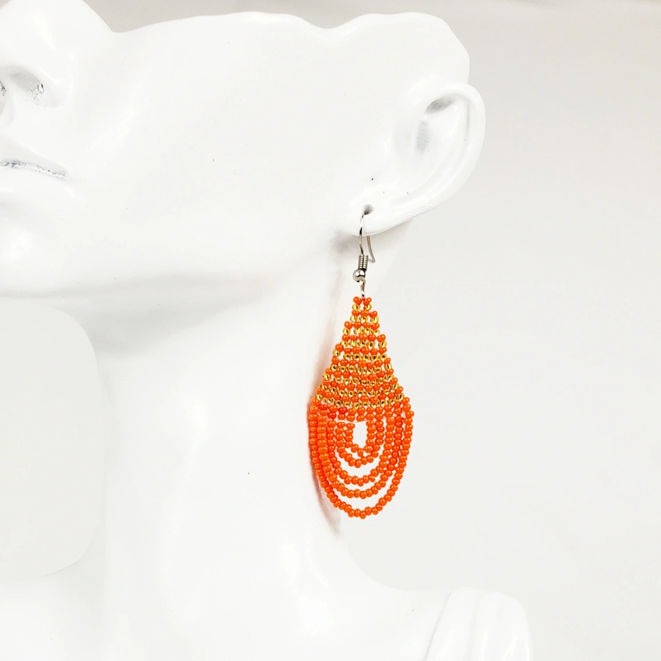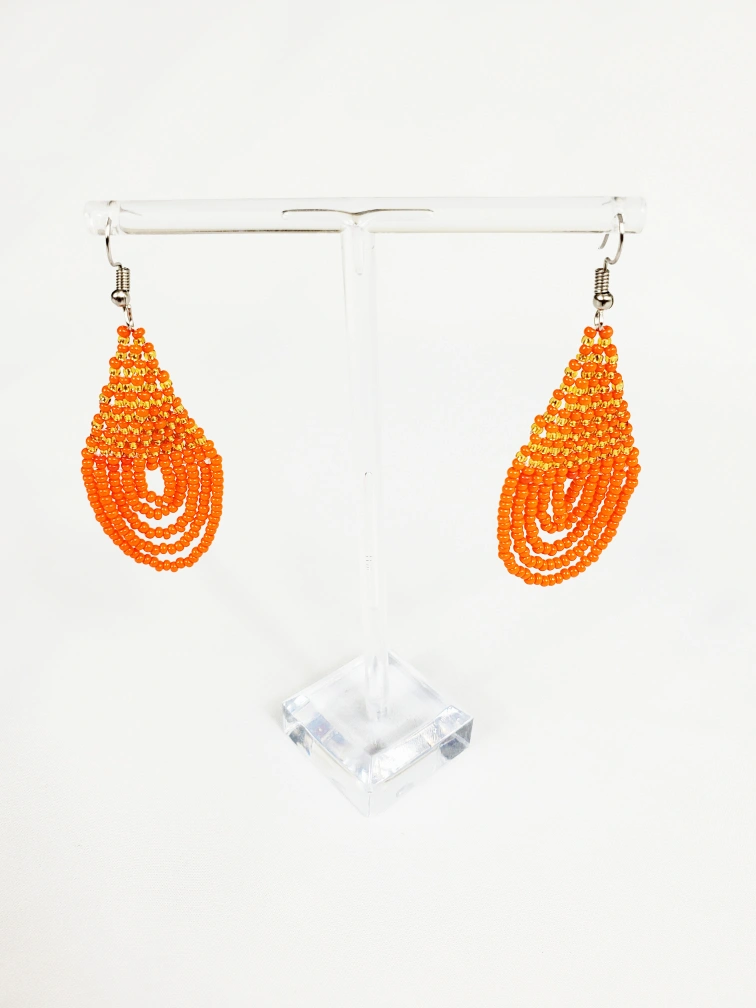 Handcrafted African earrings made of orange beads. The earrings feature a teardrop shape, with multiple strands of orange beads. These earrings could add a splash of colour to any outfit, and are perfect for a summer day.