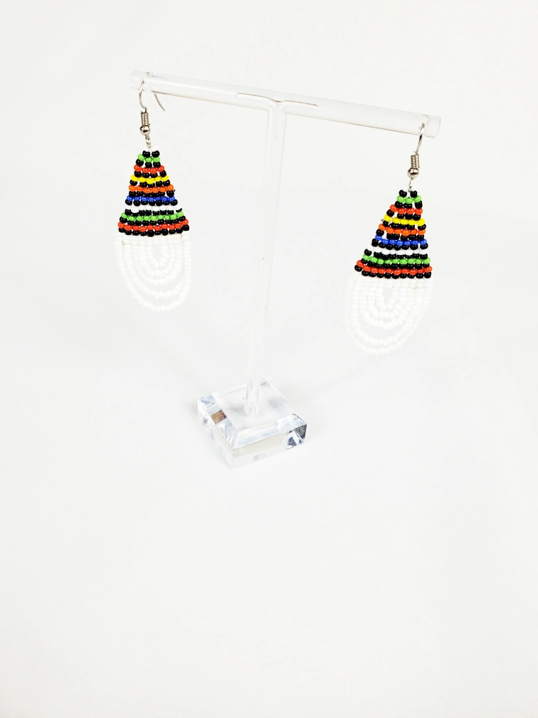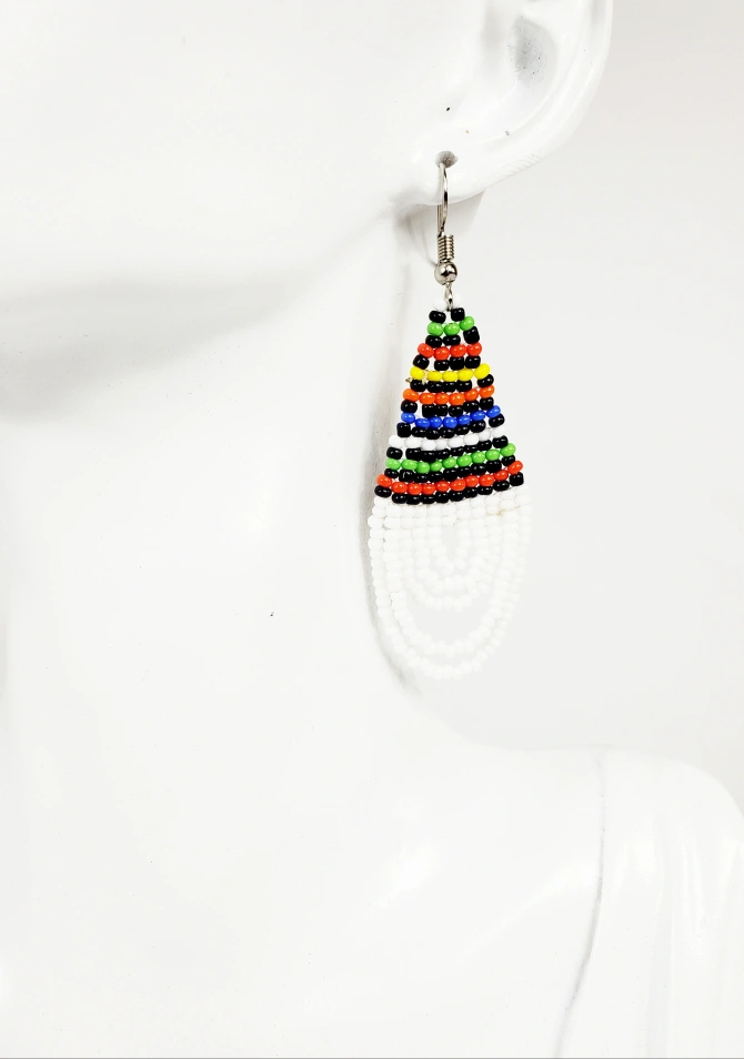 Handcrafted African earrings made of white and colorful beads. The earrings feature a teardrop shape, with multiple strands of colourful beads. These earrings could add a splash of colour to any outfit, and are perfect for a summer day.