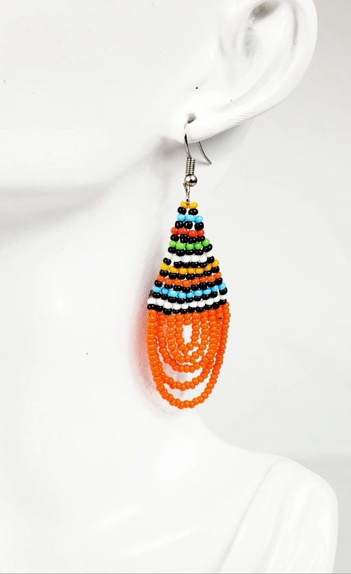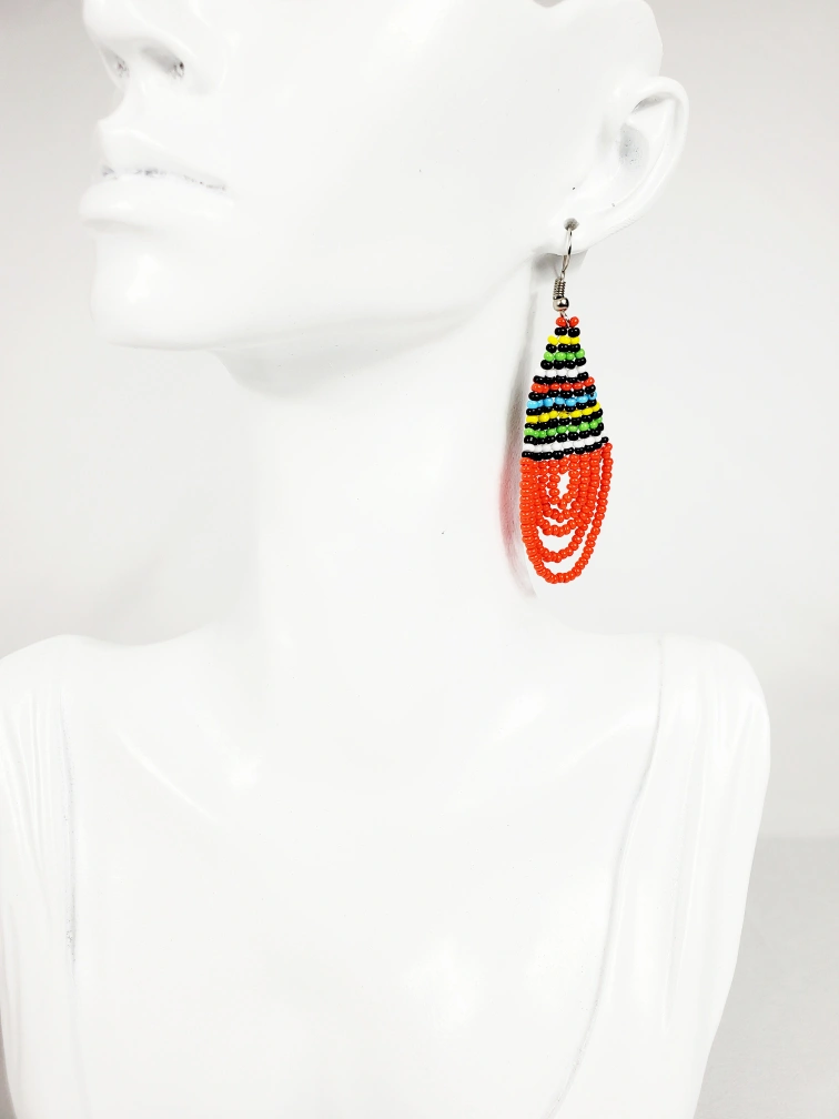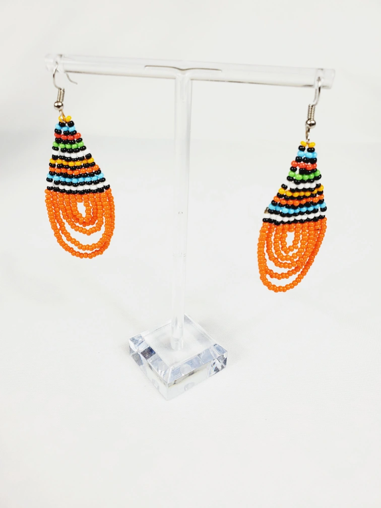 Handcrafted African earrings made of orange and colorful beads. The earrings feature a teardrop shape, with multiple strands of colourful beads. These earrings could add a splash of colour to any outfit, and are perfect for a summer day.