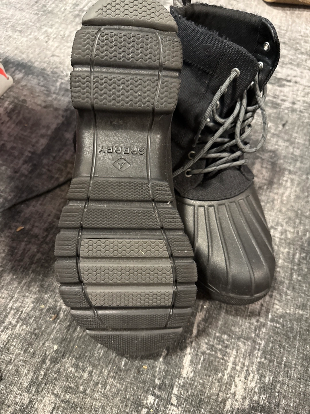 Quality brand Used once Black boots with grey laces. Features black soles and a waterproof design. These boots would be ideal for a casual walk in the park.