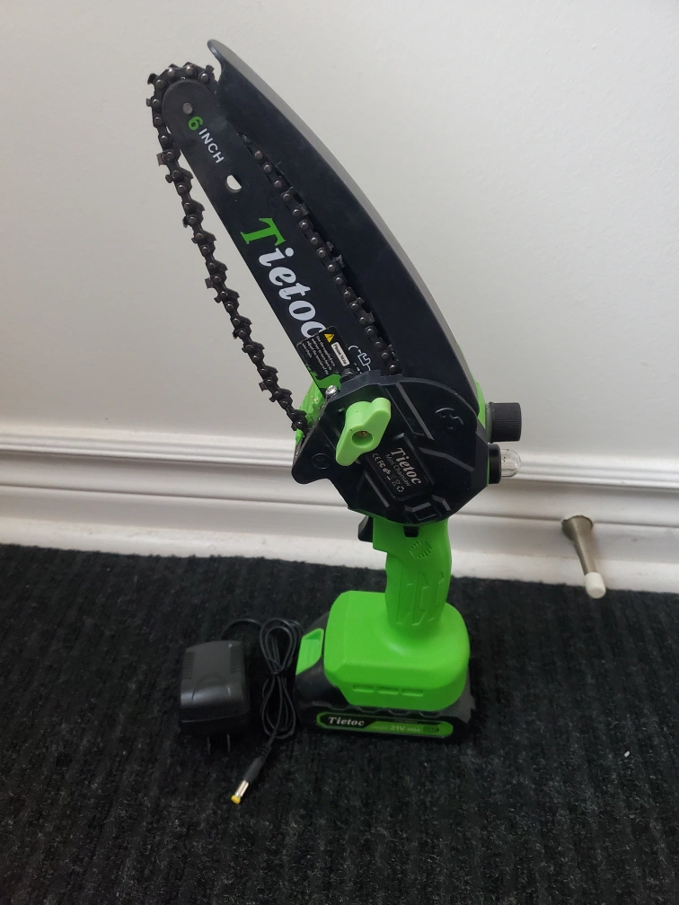 Thi mini chainsaw is green and black. It has a chain with the 6-inch blade. A battery and charger are included. Using this chainsaw could provide a sense of accomplishment and peace.