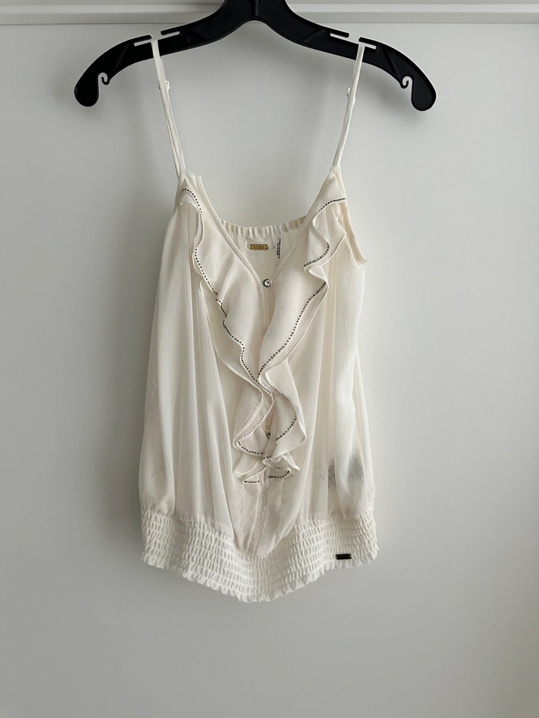 It features adjustable straps, elastic band at the bottom, and jewelled buttons in the front with cascading ruffles. Flirty top!