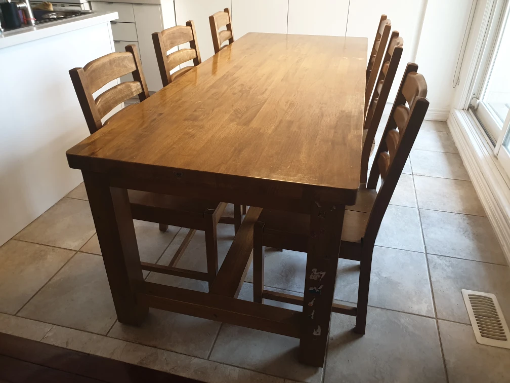 Beautiful dining set. Comes with a beautiful wooden table. Features six matching chairs. T