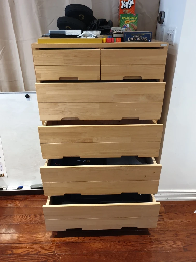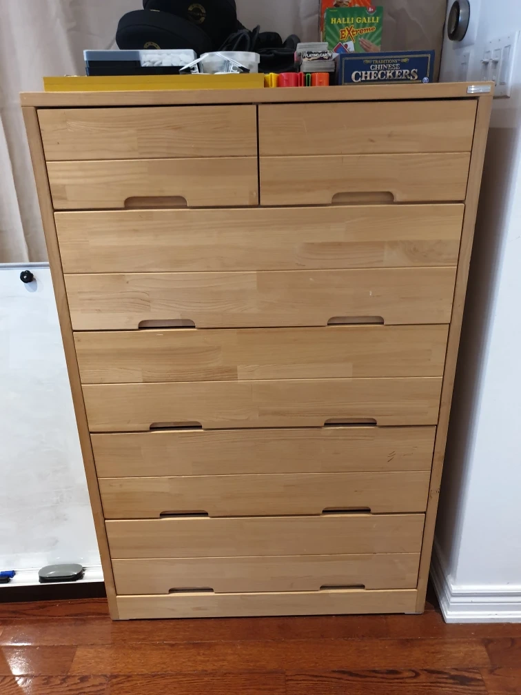 This is a solid wood chest of drawers with several drawers. It has drawers with handles in a natural wood tone, making it very useful for storing and organizing your belongings. This product is imported from Korea. It is heavy because of the high quality of the solid wood. Please bring someone to help you carry it.