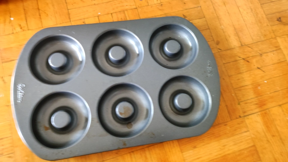 A six-cavity donut pan. Features a non-stick coating. Perfect for baking some donuts.