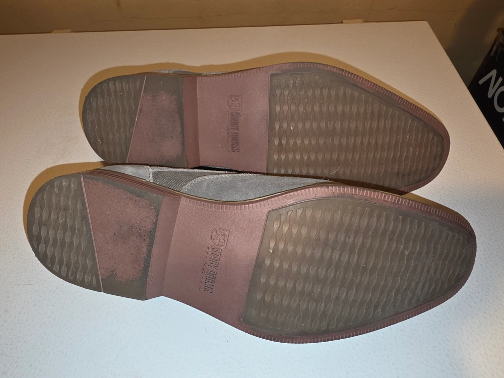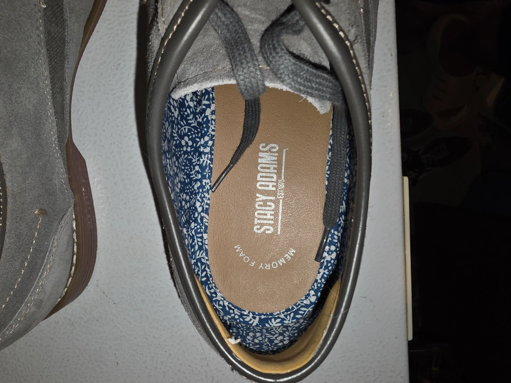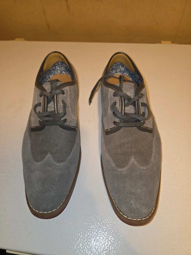 Stylish grey lace-up shoes. Features a suede upper, brown soles. The insoles have a floral pattern (Ai)